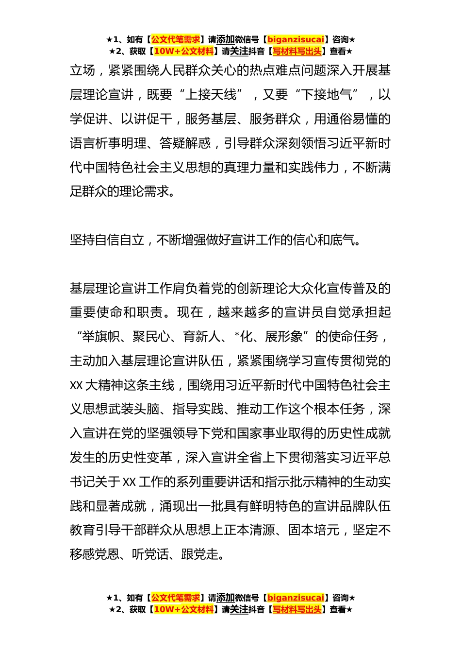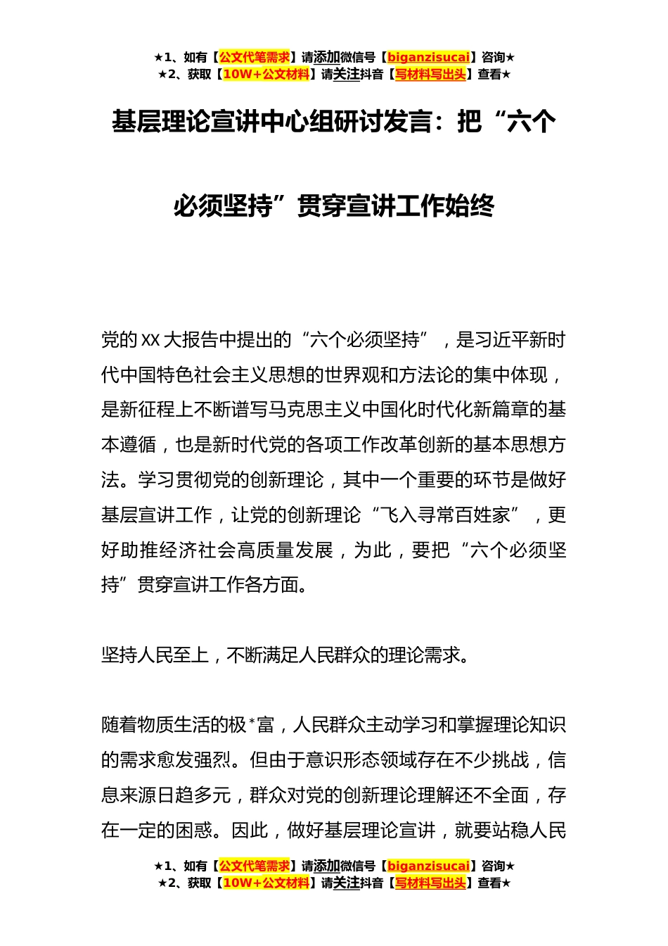 ★1、如有【公文代笔需求】请添加微信号【biganzisucai】咨询★★2、获取【10W+公文材料】请关注抖音【写材料写出头】查看★基层理论宣讲中心组研讨发言:把“六个必须坚持”贯穿宣讲工作始终党的XX大报告中提出的“六个必须坚持”,是习近平新时代中国特色社会主义思想的世界观和方法论的集中体现,是新征程上不断谱写马克思主义中国化时代化新篇章的基本遵循,也是新时代党的各项工作改革创新的基本思想方法。学习贯彻党的创新理论,其中一个重要的环节是做好基层宣讲工作,让党的创新理论“飞入寻常百姓家”,更好助推经济社会高质量发展,为此,要把“六个必须坚持”贯穿宣讲工作各方面。坚持人民至上,不断满足人民群众的理论需求。随着物质生活的极*富,人民群众主动学习和掌握理论知识的需求愈发强烈。但由...