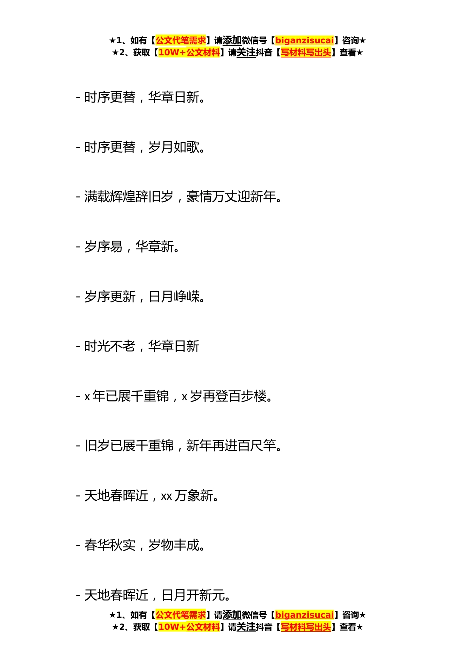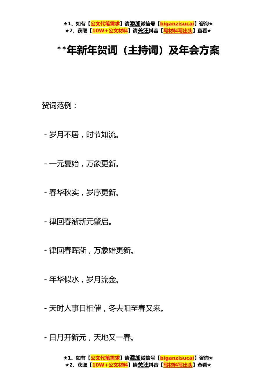 ★1、如有【公文代笔需求】请添加微信号【biganzisucai】咨询★★2、获取【10W+公文材料】请关注抖音【写材料写出头】查看★**年新年贺词(主持词)及年会方案贺词范例:-岁月不居,时节如流。-一元复始,万象更新。-春华秋实,岁序更新。-律回春渐新元肇启。-律回春晖渐,万象始更新。-年华似水,岁月流金。-天时人事日相催,冬去阳至春又来。-日月开新元,天地又一春。★1、如有【公文代笔需求】请添加微信号【biganzisucai】咨询★★2、获取【10W+公文材料】请关注抖音【写材料写出头】查看★★1、如有【公文代笔需求】请添加微信号【biganzisucai】咨询★★2、获取【10W+公文材料】请关注抖音【写材料写出头】查看★-时序更替,华章日新。-时序更替,岁月如歌。-满载辉煌辞旧岁,豪情万丈迎新年。...
