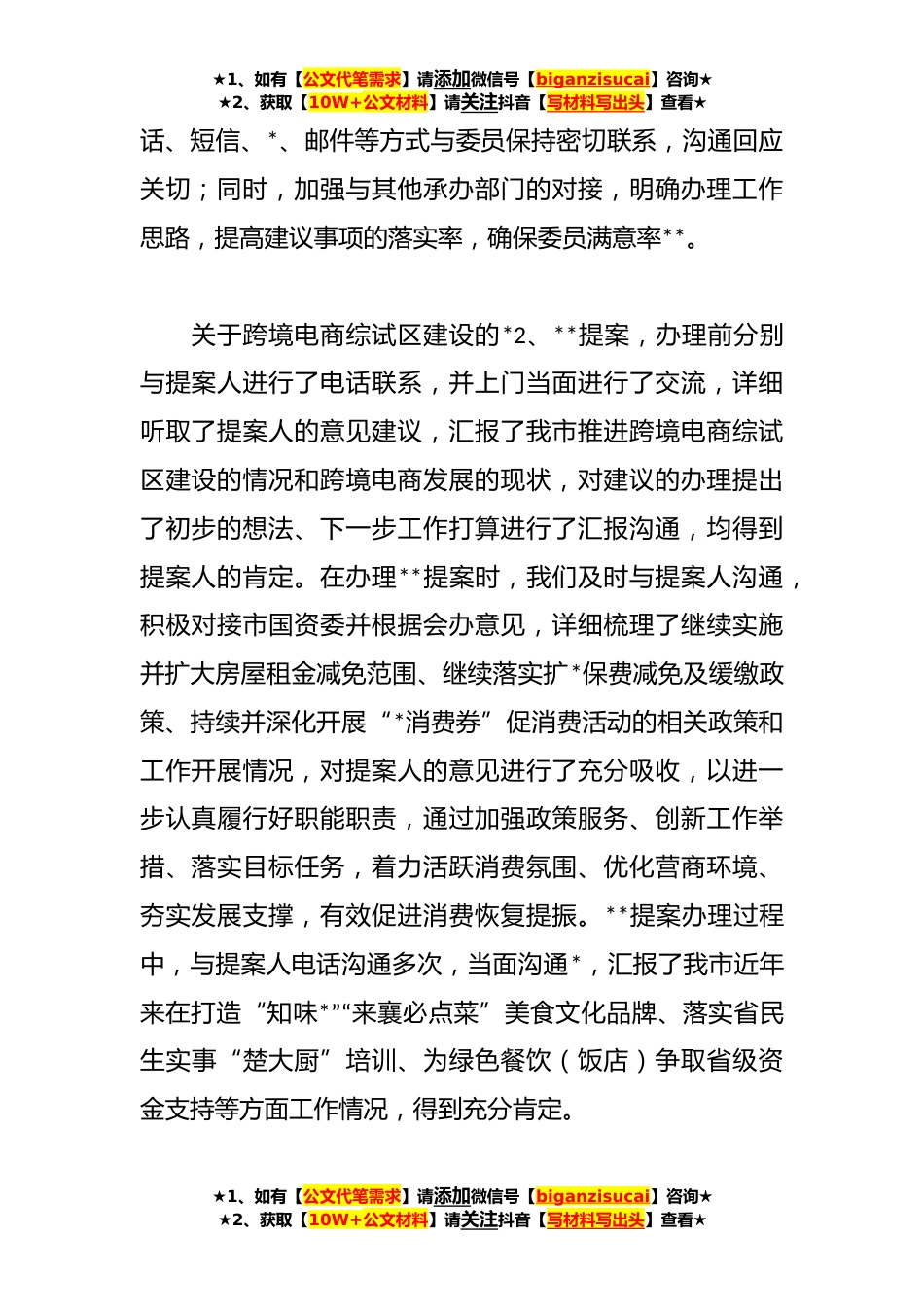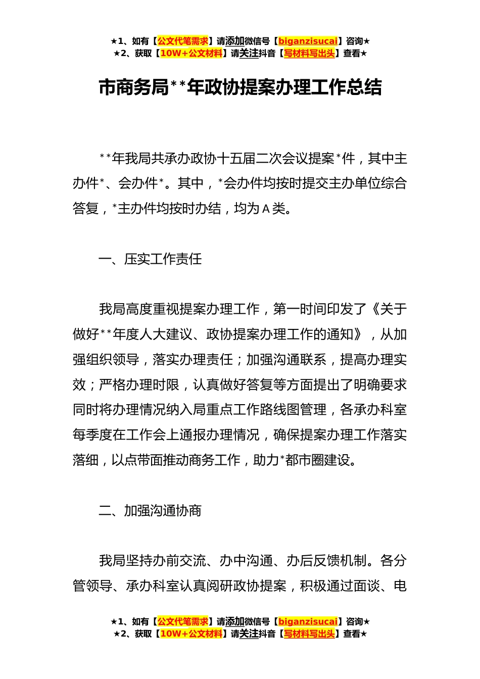 ★1、如有【公文代笔需求】请添加微信号【biganzisucai】咨询★★2、获取【10W+公文材料】请关注抖音【写材料写出头】查看★市商务局**年政协提案办理工作总结**年我局共承办政协十五届二次会议提案*件,其中主办件*、会办件*。其中,*会办件均按时提交主办单位综合答复,*主办件均按时办结,均为A类。一、压实工作责任我局高度重视提案办理工作,第一时间印发了《关于做好**年度人大建议、政协提案办理工作的通知》,从加强组织领导,落实办理责任;加强沟通联系,提高办理实效;严格办理时限,认真做好答复等方面提出了明确要求同时将办理情况纳入局重点工作路线图管理,各承办科室每季度在工作会上通报办理情况,确保提案办理工作落实落细,以点带面推动商务工作,助力*都市圈建设。二、加强沟通协商我局坚持办...