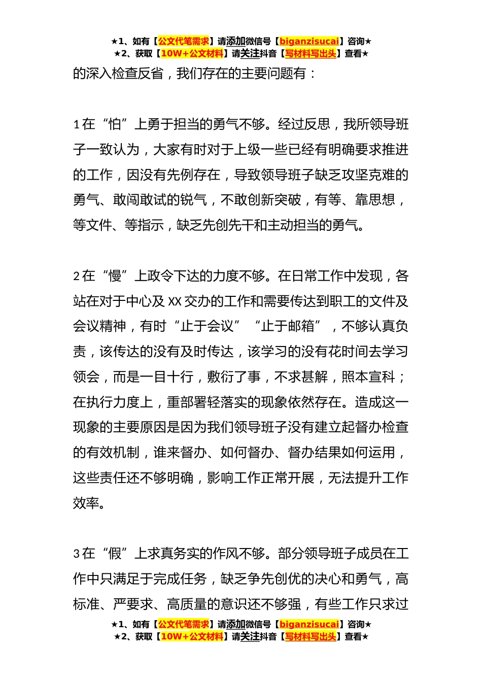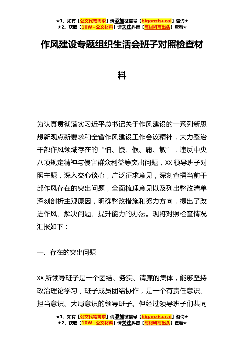 ★1、如有【公文代笔需求】请添加微信号【biganzisucai】咨询★★2、获取【10W+公文材料】请关注抖音【写材料写出头】查看★作风建设专题组织生活会班子对照检查材料为认真贯彻落实习近平总书记关于作风建设的一系列新思想新观点新要求和全省作风建设工作会议精神,大力整治干部作风领域存在的“怕、慢、假、庸、散”,违反中央八项规定精神与侵害群众利益等突出问题,XX领导班子对照主题,深入交心谈心,广泛征求意见,深刻查摆当前干部作风存在的突出问题,全面梳理意见以及列出整改清单深刻剖析主观原因,明确整改措施和努力方向,提出了改进作风、解决问题、提升能力的办法。现将对照检查情况汇报如下:一、存在的突出问题XX所领导班子是一个团结、务实、清廉的集体,能够坚持政治理论学习,班子成员团结协作...