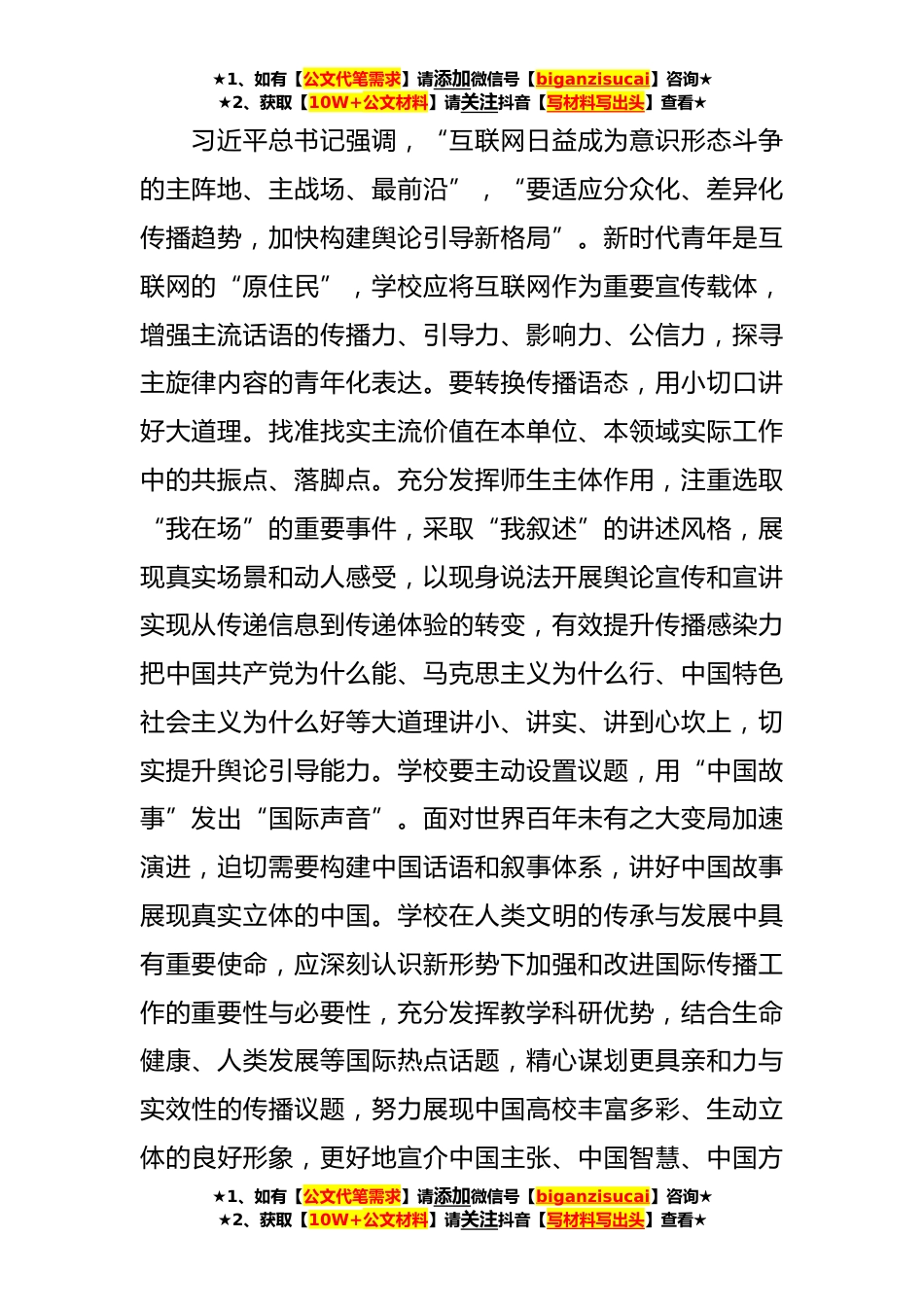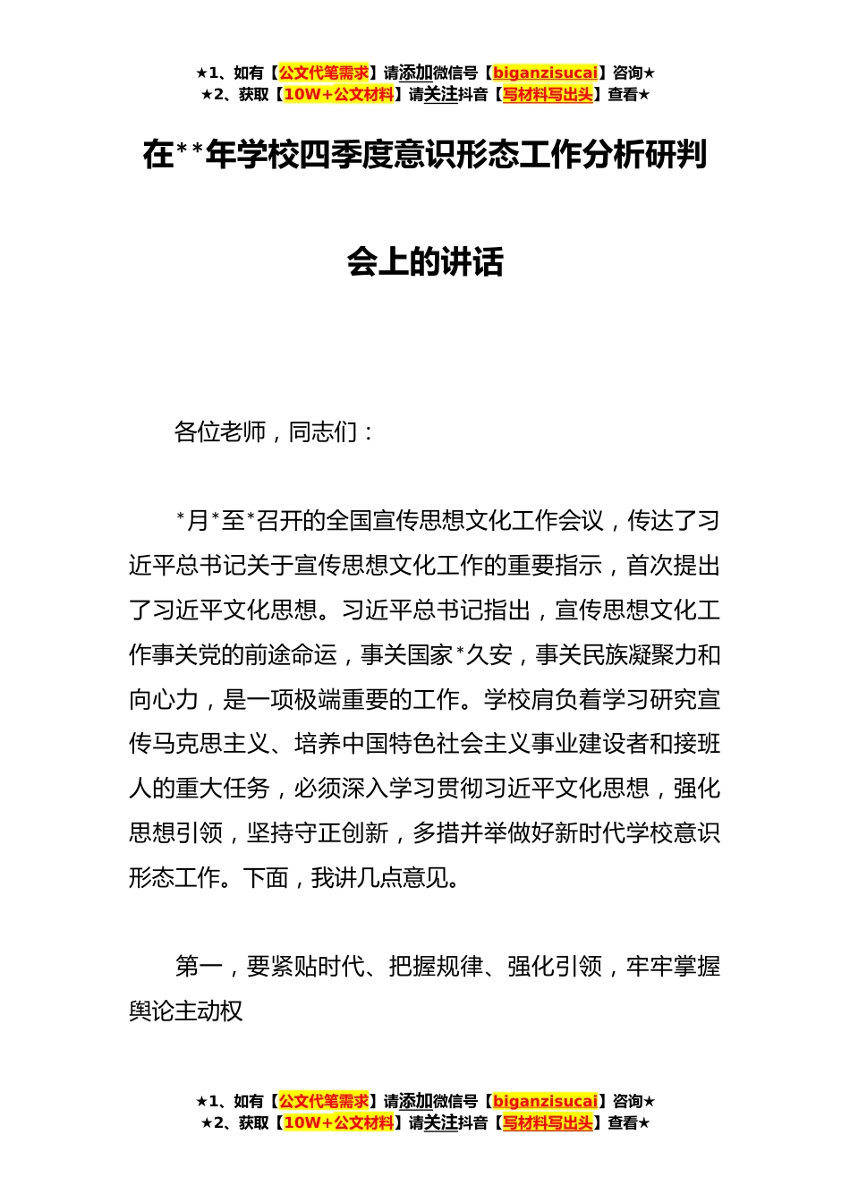 ★1、如有【公文代笔需求】请添加微信号【biganzisucai】咨询★★2、获取【10W+公文材料】请关注抖音【写材料写出头】查看★在**年学校四季度意识形态工作分析研判会上的讲话各位老师,同志们:*月*至*召开的全国宣传思想文化工作会议,传达了习近平总书记关于宣传思想文化工作的重要指示,首次提出了习近平文化思想。习近平总书记指出,宣传思想文化工作事关党的前途命运,事关国家*久安,事关民族凝聚力和向心力,是一项极端重要的工作。学校肩负着学习研究宣传马克思主义、培养中国特色社会主义事业建设者和接班人的重大任务,必须深入学习贯彻习近平文化思想,强化思想引领,坚持守正创新,多措并举做好新时代学校意识形态工作。下面,我讲几点意见。第一,要紧贴时代、把握规律、强化引领,牢牢掌握舆论主动...