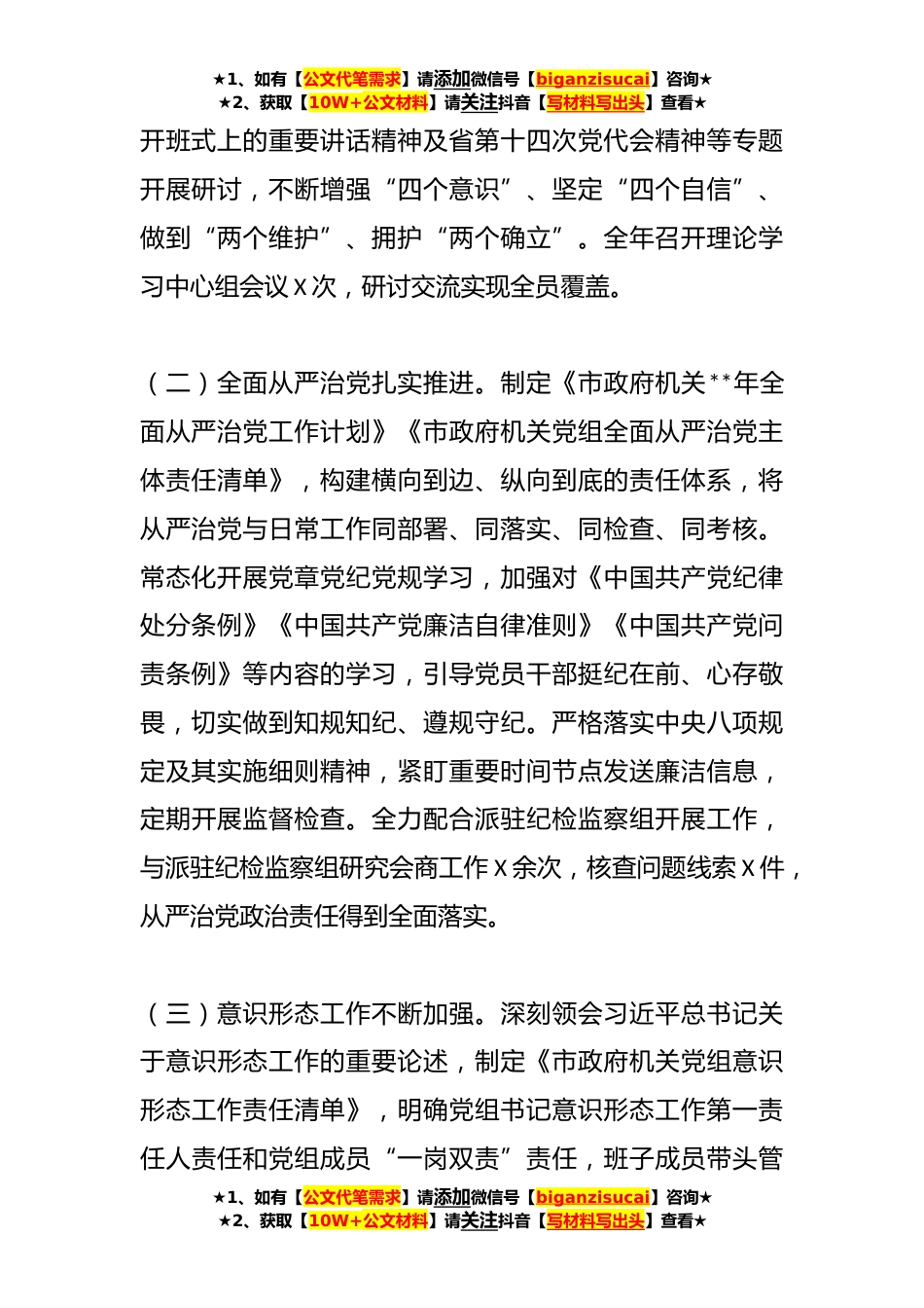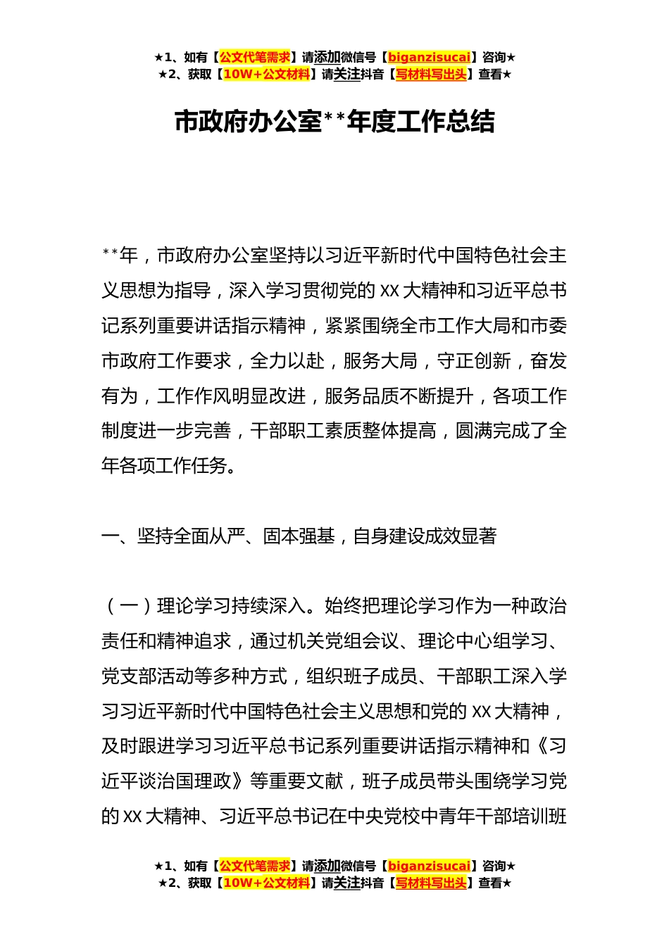 ★1、如有【公文代笔需求】请添加微信号【biganzisucai】咨询★★2、获取【10W+公文材料】请关注抖音【写材料写出头】查看★市政府办公室**年度工作总结**年,市政府办公室坚持以习近平新时代中国特色社会主义思想为指导,深入学习贯彻党的XX大精神和习近平总书记系列重要讲话指示精神,紧紧围绕全市工作大局和市委市政府工作要求,全力以赴,服务大局,守正创新,奋发有为,工作作风明显改进,服务品质不断提升,各项工作制度进一步完善,干部职工素质整体提高,圆满完成了全年各项工作任务。一、坚持全面从严、固本强基,自身建设成效显著(一)理论学习持续深入。始终把理论学习作为一种政治责任和精神追求,通过机关党组会议、理论中心组学习、党支部活动等多种方式,组织班子成员、干部职工深入学习习近平新...