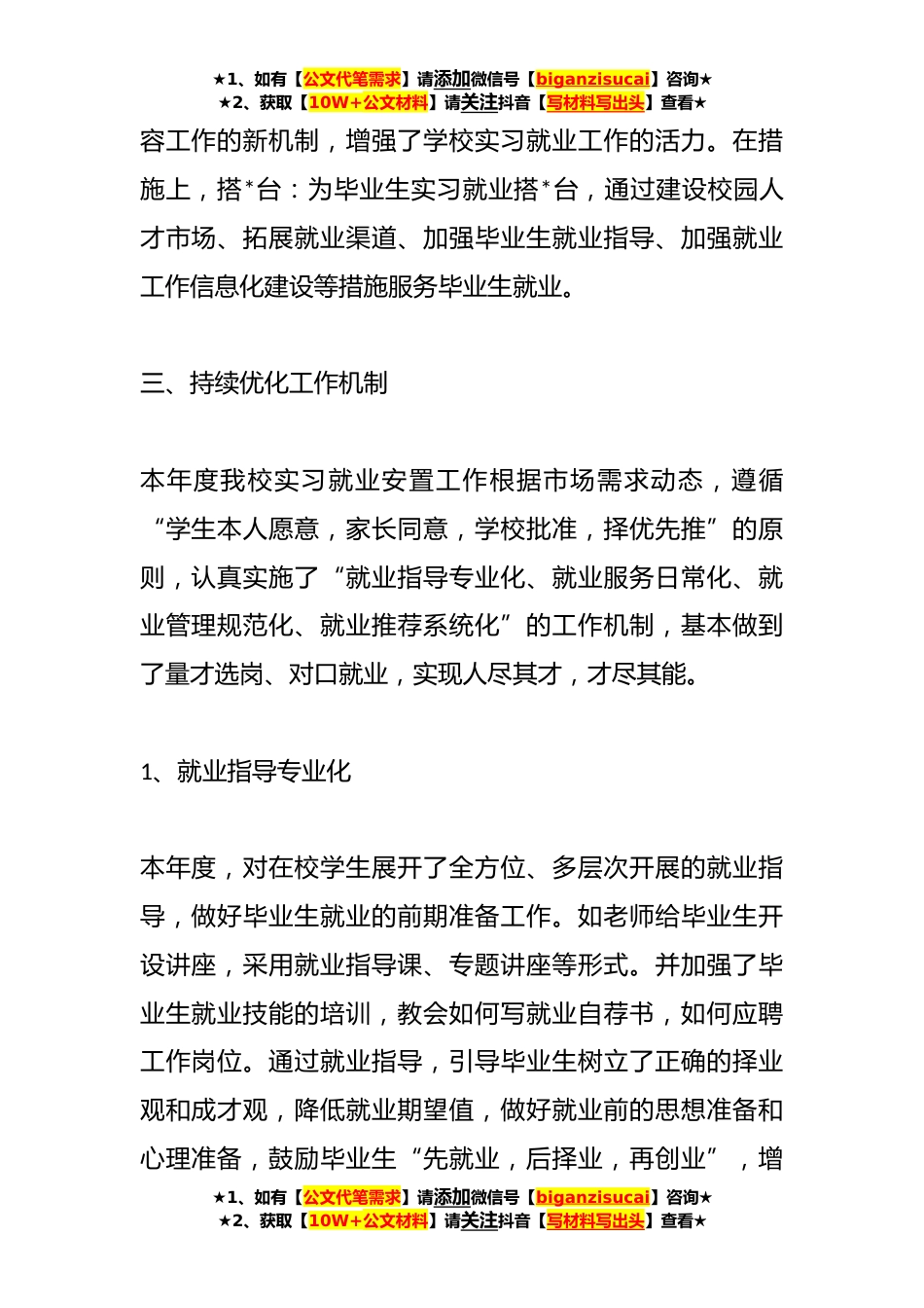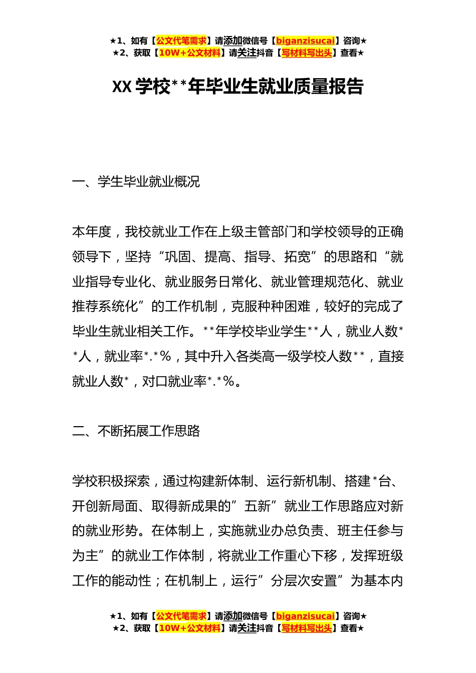 ★1、如有【公文代笔需求】请添加微信号【biganzisucai】咨询★★2、获取【10W+公文材料】请关注抖音【写材料写出头】查看★XX学校**年毕业生就业质量报告一、学生毕业就业概况本年度,我校就业工作在上级主管部门和学校领导的正确领导下,坚持“巩固、提高、指导、拓宽”的思路和“就业指导专业化、就业服务日常化、就业管理规范化、就业推荐系统化”的工作机制,克服种种困难,较好的完成了毕业生就业相关工作。**年学校毕业学生**人,就业人数**人,就业率*.*%,其中升入各类高一级学校人数**,直接就业人数*,对口就业率*.*%。二、不断拓展工作思路学校积极探索,通过构建新体制、运行新机制、搭建*台、开创新局面、取得新成果的”五新”就业工作思路应对新的就业形势。在体制上,实施就业办总负责、班主任...