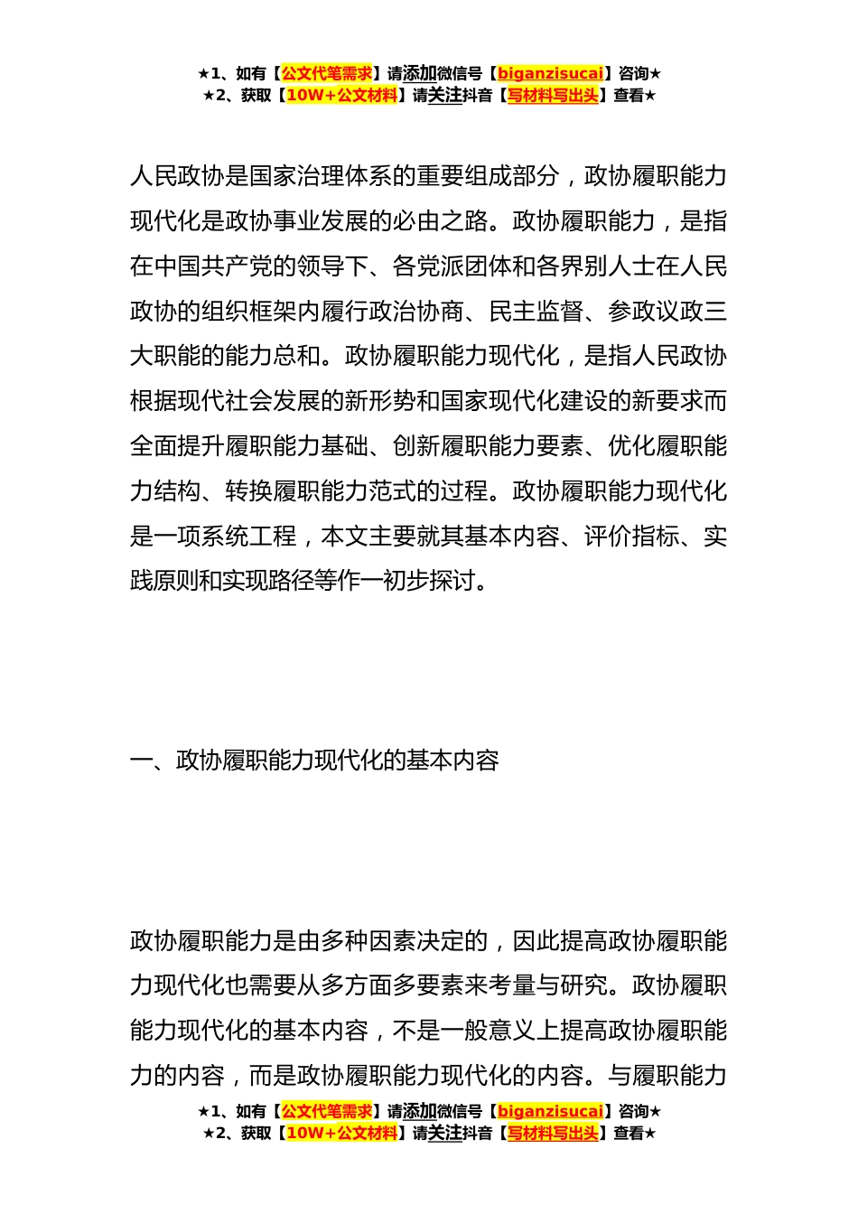 ★1、如有【公文代笔需求】请添加微信号【biganzisucai】咨询★★2、获取【10W+公文材料】请关注抖音【写材料写出头】查看★关于人民政协履职能力现代化的理论研究与实现路径人民政协是国家治理体系的重要组成部分,政协履职能力现代化是政协事业发展的必由之路。政协履职能力现代化的基本内容应包含:履职思维的理性化、履职方式的法治化、履职机制的科学化、履职手段的网络化和履职目标的共识化;其评价指标主要涵盖履职主体、运行机制、方法思维、职能任务等四个层面;其实践原则主要应为:人民本位的价值性原则、责任担当的主体性原则、改革创新的动力性原则、讲求实效的客观性原则和协调推进的系统性原则等五个方面;其实现路径应坚持以学习培训为抓手、以彰显功能为基础、以履职创新为支撑、以机制建设为保...