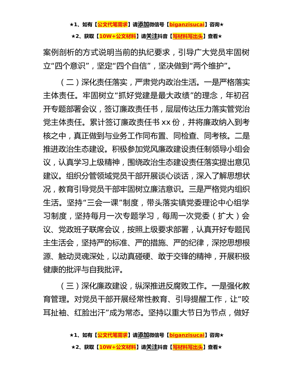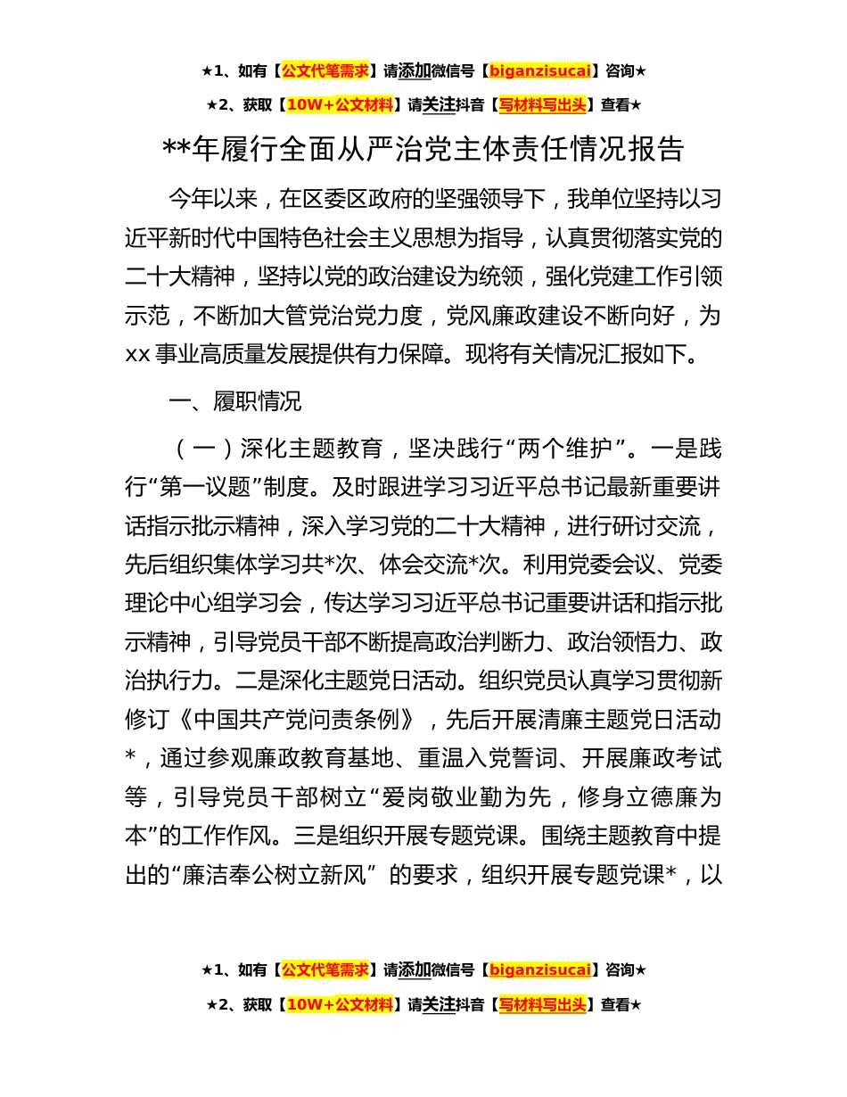 ★1、如有【公文代笔需求】请添加微信号【biganzisucai】咨询★★2、获取【10W+公文材料】请关注抖音【写材料写出头】查看★**年履行全面从严治党主体责任情况报告今年以来,在区委区政府的坚强领导下,我单位坚持以习近平新时代中国特色社会主义思想为指导,认真贯彻落实党的二十大精神,坚持以党的政治建设为统领,强化党建工作引领示范,不断加大管党治党力度,党风廉政建设不断向好,为xx事业高质量发展提供有力保障。现将有关情况汇报如下。一、履职情况“”(一)深化主题教育,坚决践行两个维护。一是践“”行第一议题制度。及时跟进学习习近平总书记最新重要讲话指示批示精神,深入学习党的二十大精神,进行研讨交流,先后组织集体学习共*次、体会交流*次。利用党委会议、党委理论中心组学习会,传达学习...