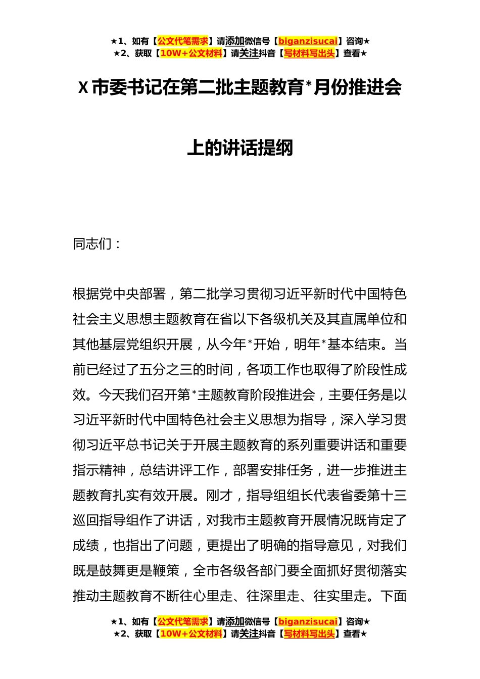 ★1、如有【公文代笔需求】请添加微信号【biganzisucai】咨询★★2、获取【10W+公文材料】请关注抖音【写材料写出头】查看★X市委书记在第二批主题教育*月份推进会上的讲话提纲同志们:根据党中央部署,第二批学习贯彻习近平新时代中国特色社会主义思想主题教育在省以下各级机关及其直属单位和其他基层党组织开展,从今年*开始,明年*基本结束。当前已经过了五分之三的时间,各项工作也取得了阶段性成效。今天我们召开第*主题教育阶段推进会,主要任务是以习近平新时代中国特色社会主义思想为指导,深入学习贯彻习近平总书记关于开展主题教育的系列重要讲话和重要指示精神,总结讲评工作,部署安排任务,进一步推进主题教育扎实有效开展。刚才,指导组组长代表省委第十三巡回指导组作了讲话,对我市主题教育开展情...