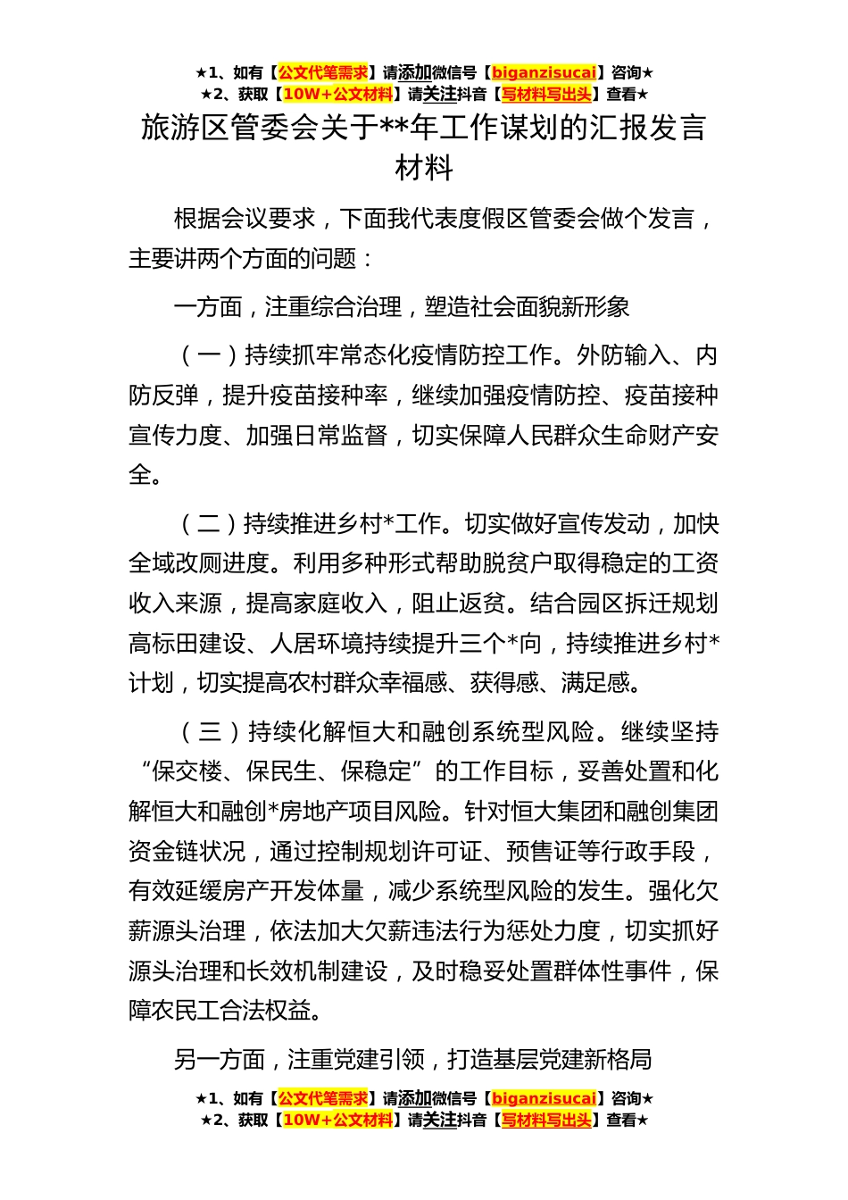 ★1、如有【公文代笔需求】请添加微信号【biganzisucai】咨询★★2、获取【10W+公文材料】请关注抖音【写材料写出头】查看★★1、如有【公文代笔需求】请添加微信号【biganzisucai】咨询★★2、获取【10W+公文材料】请关注抖音【写材料写出头】查看★★1、如有【公文代笔需求】请添加微信号【biganzisucai】咨询★★2、获取【10W+公文材料】请关注抖音【写材料写出头】查看★旅游区管委会关于**年工作谋划的汇报发言材料根据会议要求,下面我代表度假区管委会做个发言,主要讲两个方面的问题:一方面,注重综合治理,塑造社会面貌新形象(一)持续抓牢常态化疫情防控工作。外防输入、内防反弹,提升疫苗接种率,继续加强疫情防控、疫苗接种宣传力度、加强日常监督,切实保障人民群众生命财产安全。(二)持续推进...