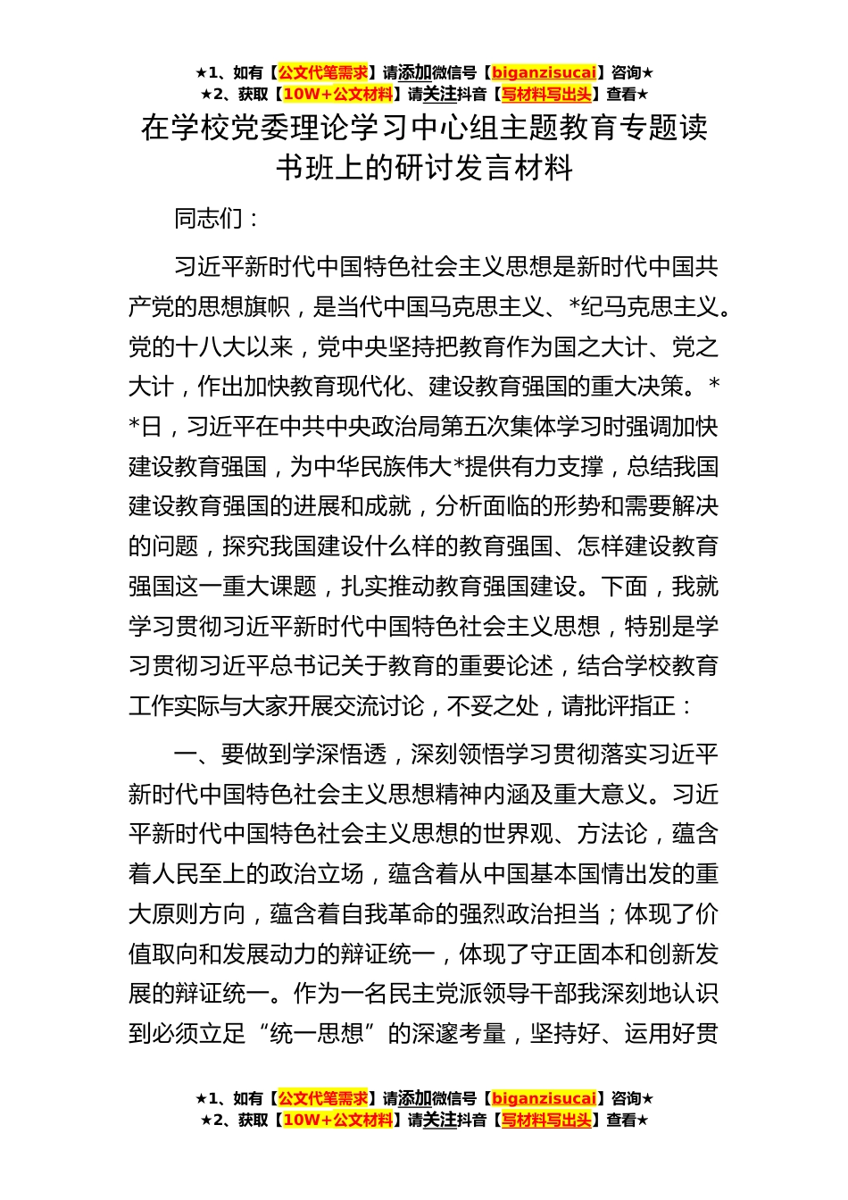 ★1、如有【公文代笔需求】请添加微信号【biganzisucai】咨询★★2、获取【10W+公文材料】请关注抖音【写材料写出头】查看★★1、如有【公文代笔需求】请添加微信号【biganzisucai】咨询★★2、获取【10W+公文材料】请关注抖音【写材料写出头】查看★★1、如有【公文代笔需求】请添加微信号【biganzisucai】咨询★★2、获取【10W+公文材料】请关注抖音【写材料写出头】查看★在学校党委理论学习中心组主题教育专题读书班上的研讨发言材料同志们:习近平新时代中国特色社会主义思想是新时代中国共产党的思想旗帜,是当代中国马克思主义、*纪马克思主义。党的十八大以来,党中央坚持把教育作为国之大计、党之大计,作出加快教育现代化、建设教育强国的重大决策。**日,习近平在中共中央政治局第五次集体学习时强调加...
