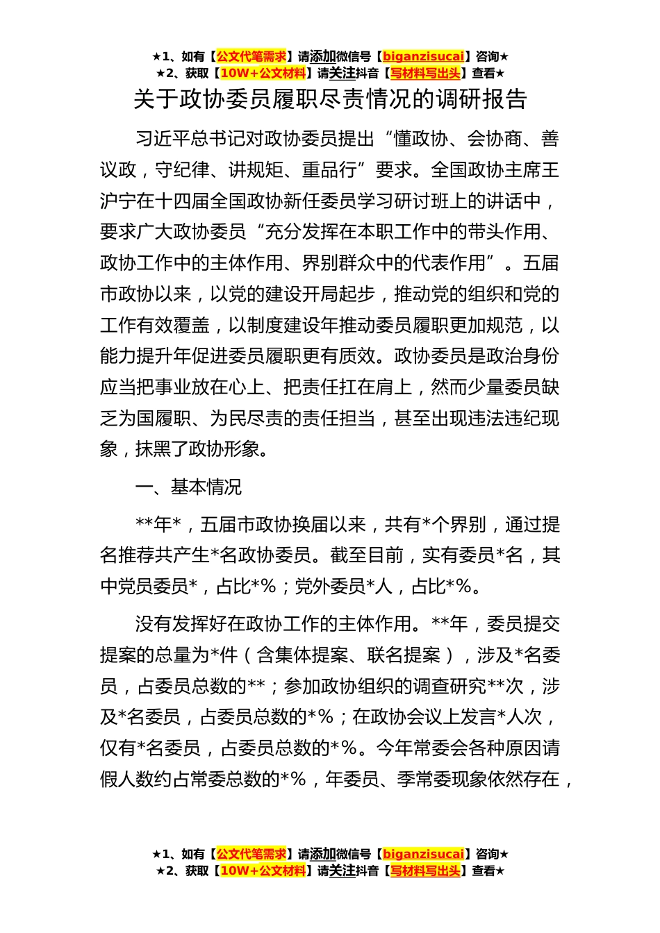 ★1、如有【公文代笔需求】请添加微信号【biganzisucai】咨询★★2、获取【10W+公文材料】请关注抖音【写材料写出头】查看★★1、如有【公文代笔需求】请添加微信号【biganzisucai】咨询★★2、获取【10W+公文材料】请关注抖音【写材料写出头】查看★★1、如有【公文代笔需求】请添加微信号【biganzisucai】咨询★★2、获取【10W+公文材料】请关注抖音【写材料写出头】查看★关于政协委员履职尽责情况的调研报告习近平总书记对政协委员提出“懂政协、会协商、善议政,守纪律、讲规矩、重品行”要求。全国政协主席王沪宁在十四届全国政协新任委员学习研讨班上的讲话中,要求广大政协委员“充分发挥在本职工作中的带头作用、政协工作中的主体作用、界别群众中的代表作用”。五届市政协以来,以党的建设开局起步,推...