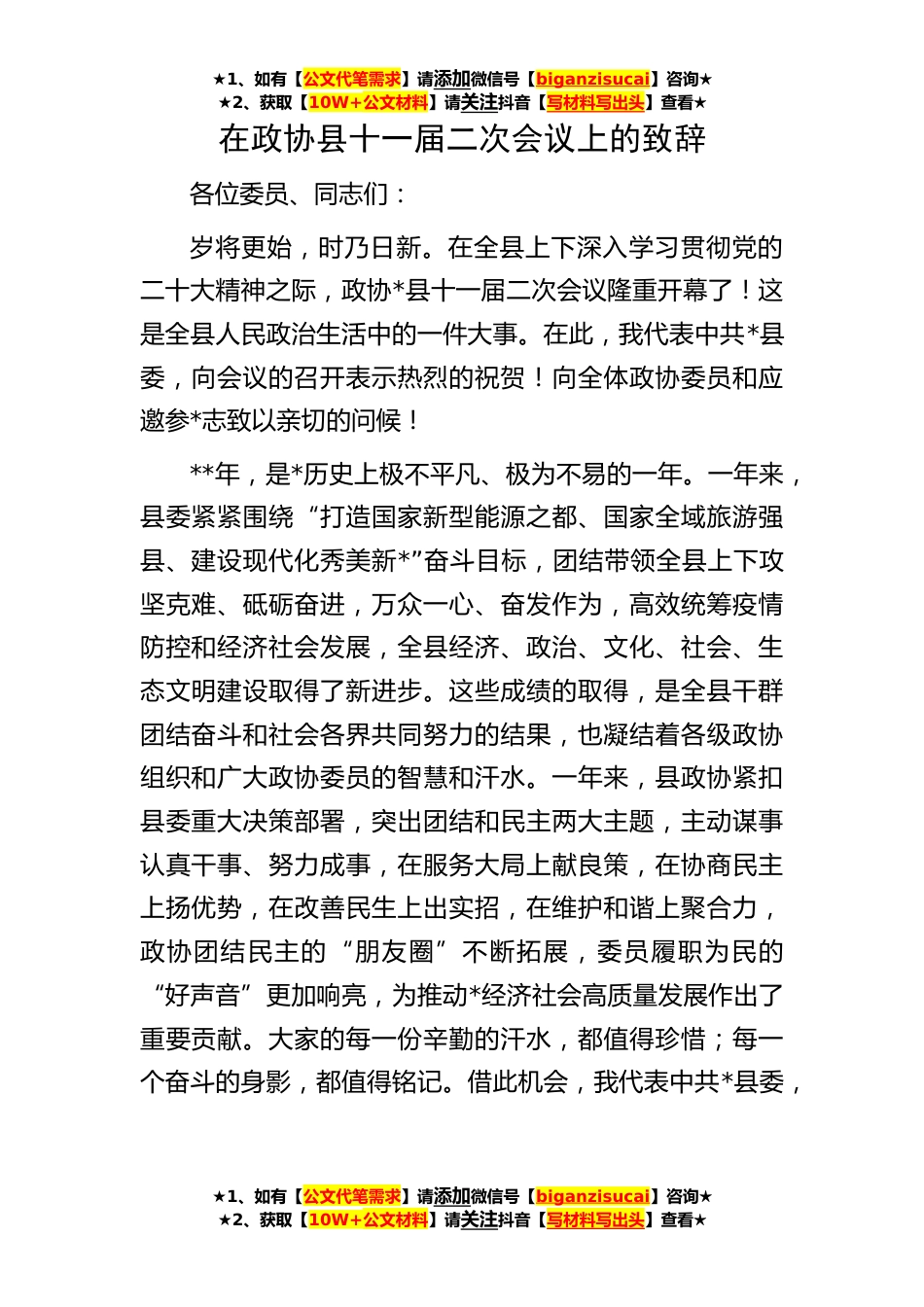 ★1、如有【公文代笔需求】请添加微信号【biganzisucai】咨询★★2、获取【10W+公文材料】请关注抖音【写材料写出头】查看★★1、如有【公文代笔需求】请添加微信号【biganzisucai】咨询★★2、获取【10W+公文材料】请关注抖音【写材料写出头】查看★★1、如有【公文代笔需求】请添加微信号【biganzisucai】咨询★★2、获取【10W+公文材料】请关注抖音【写材料写出头】查看★在政协县十一届二次会议上的致辞各位委员、同志们:岁将更始,时乃日新。在全县上下深入学习贯彻党的二十大精神之际,政协*县十一届二次会议隆重开幕了!这是全县人民政治生活中的一件大事。在此,我代表中共*县委,向会议的召开表示热烈的祝贺!向全体政协委员和应邀参*志致以亲切的问候!**年,是*历史上极不平凡、极为不易的一年。一年...