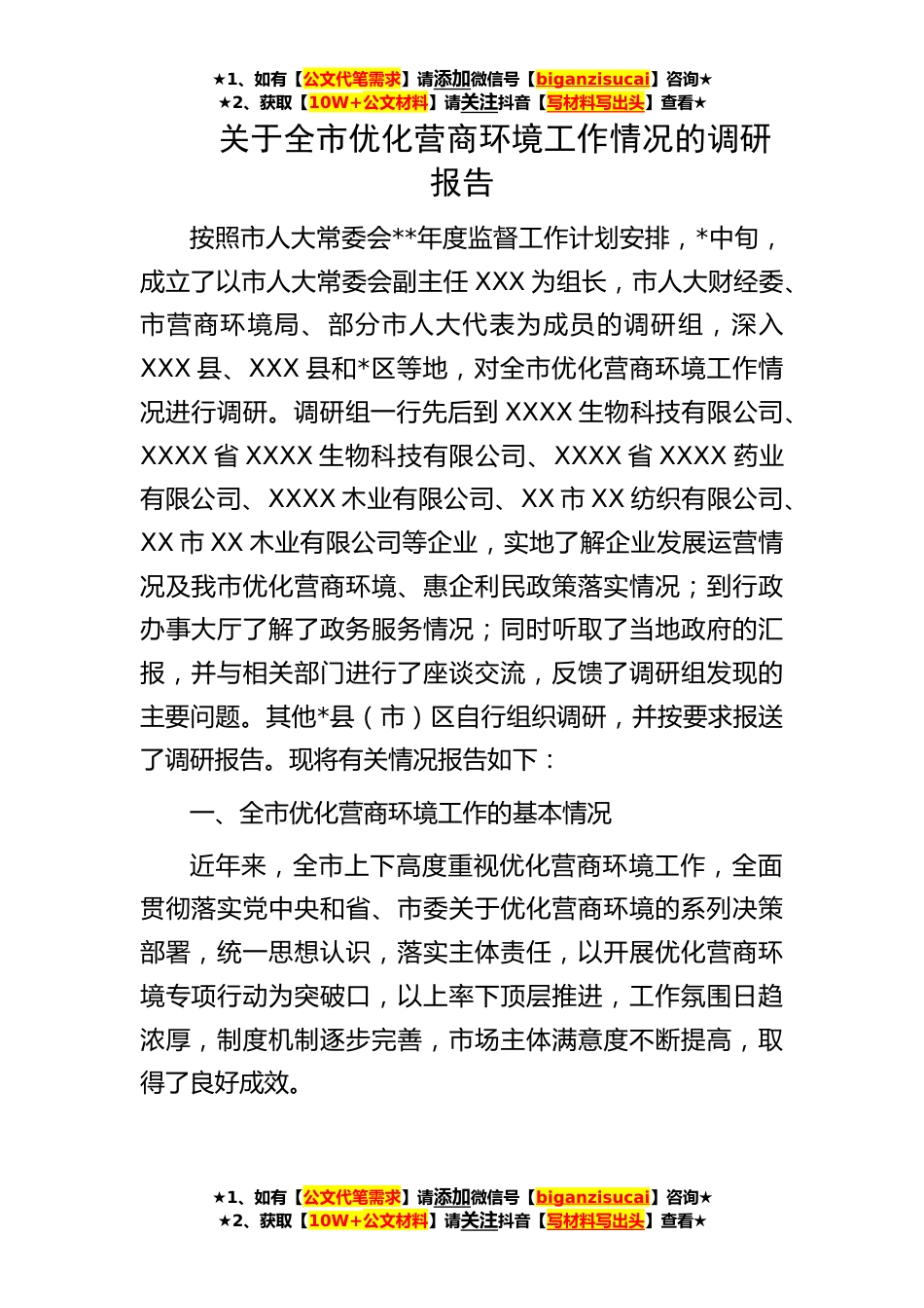 ★1、如有【公文代笔需求】请添加微信号【biganzisucai】咨询★★2、获取【10W+公文材料】请关注抖音【写材料写出头】查看★★1、如有【公文代笔需求】请添加微信号【biganzisucai】咨询★★2、获取【10W+公文材料】请关注抖音【写材料写出头】查看★★1、如有【公文代笔需求】请添加微信号【biganzisucai】咨询★★2、获取【10W+公文材料】请关注抖音【写材料写出头】查看★关于全市优化营商环境工作情况的调研报告按照市人大常委会**年度监督工作计划安排,*中旬,成立了以市人大常委会副主任XXX为组长,市人大财经委、市营商环境局、部分市人大代表为成员的调研组,深入XXX县、XXX县和*区等地,对全市优化营商环境工作情况进行调研。调研组一行先后到XXXX生物科技有限公司、XXXX省XXXX生物科技有限公司、XXXX省...