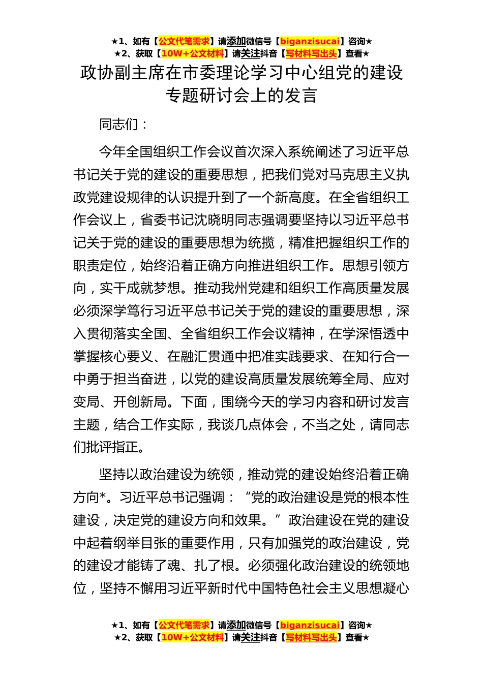★1、如有【公文代笔需求】请添加微信号【biganzisucai】咨询★★2、获取【10W+公文材料】请关注抖音【写材料写出头】查看★★1、如有【公文代笔需求】请添加微信号【biganzisucai】咨询★★2、获取【10W+公文材料】请关注抖音【写材料写出头】查看★★1、如有【公文代笔需求】请添加微信号【biganzisucai】咨询★★2、获取【10W+公文材料】请关注抖音【写材料写出头】查看★政协副主席在市委理论学习中心组党的建设专题研讨会上的发言同志们:今年全国组织工作会议首次深入系统阐述了习近平总书记关于党的建设的重要思想,把我们党对马克思主义执政党建设规律的认识提升到了一个新高度。在全省组织工作会议上,省委书记沈晓明同志强调要坚持以习近平总书记关于党的建设的重要思想为统揽,精准把握组织工作的职责...