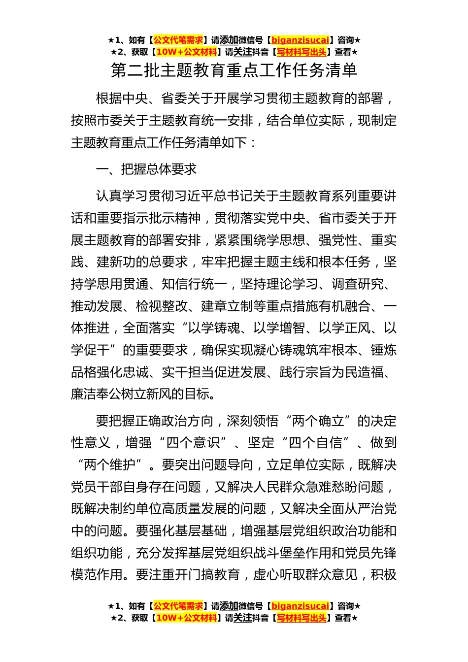 ★1、如有【公文代笔需求】请添加微信号【biganzisucai】咨询★★2、获取【10W+公文材料】请关注抖音【写材料写出头】查看★★1、如有【公文代笔需求】请添加微信号【biganzisucai】咨询★★2、获取【10W+公文材料】请关注抖音【写材料写出头】查看★★1、如有【公文代笔需求】请添加微信号【biganzisucai】咨询★★2、获取【10W+公文材料】请关注抖音【写材料写出头】查看★第二批主题教育重点工作任务清单根据中央、省委关于开展学习贯彻主题教育的部署,按照市委关于主题教育统一安排,结合单位实际,现制定主题教育重点工作任务清单如下:一、把握总体要求认真学习贯彻习近平总书记关于主题教育系列重要讲话和重要指示批示精神,贯彻落实党中央、省市委关于开展主题教育的部署安排,紧紧围绕学思想、强党性、...