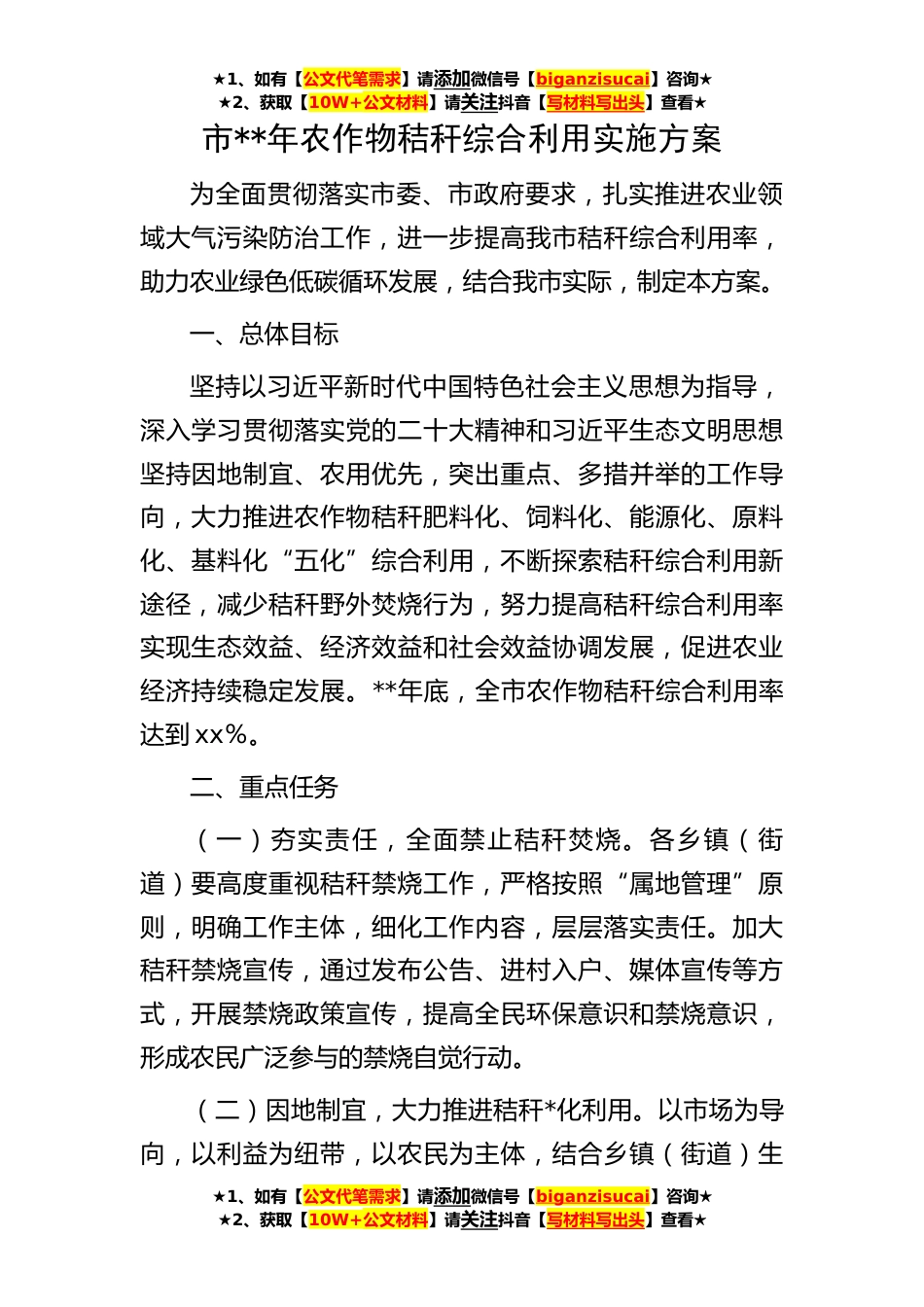 ★1、如有【公文代笔需求】请添加微信号【biganzisucai】咨询★★2、获取【10W+公文材料】请关注抖音【写材料写出头】查看★★1、如有【公文代笔需求】请添加微信号【biganzisucai】咨询★★2、获取【10W+公文材料】请关注抖音【写材料写出头】查看★★1、如有【公文代笔需求】请添加微信号【biganzisucai】咨询★★2、获取【10W+公文材料】请关注抖音【写材料写出头】查看★市**年农作物秸秆综合利用实施方案为全面贯彻落实市委、市政府要求,扎实推进农业领域大气污染防治工作,进一步提高我市秸秆综合利用率,助力农业绿色低碳循环发展,结合我市实际,制定本方案。一、总体目标坚持以习近平新时代中国特色社会主义思想为指导,深入学习贯彻落实党的二十大精神和习近平生态文明思想坚持因地制宜、农用优先,突...
