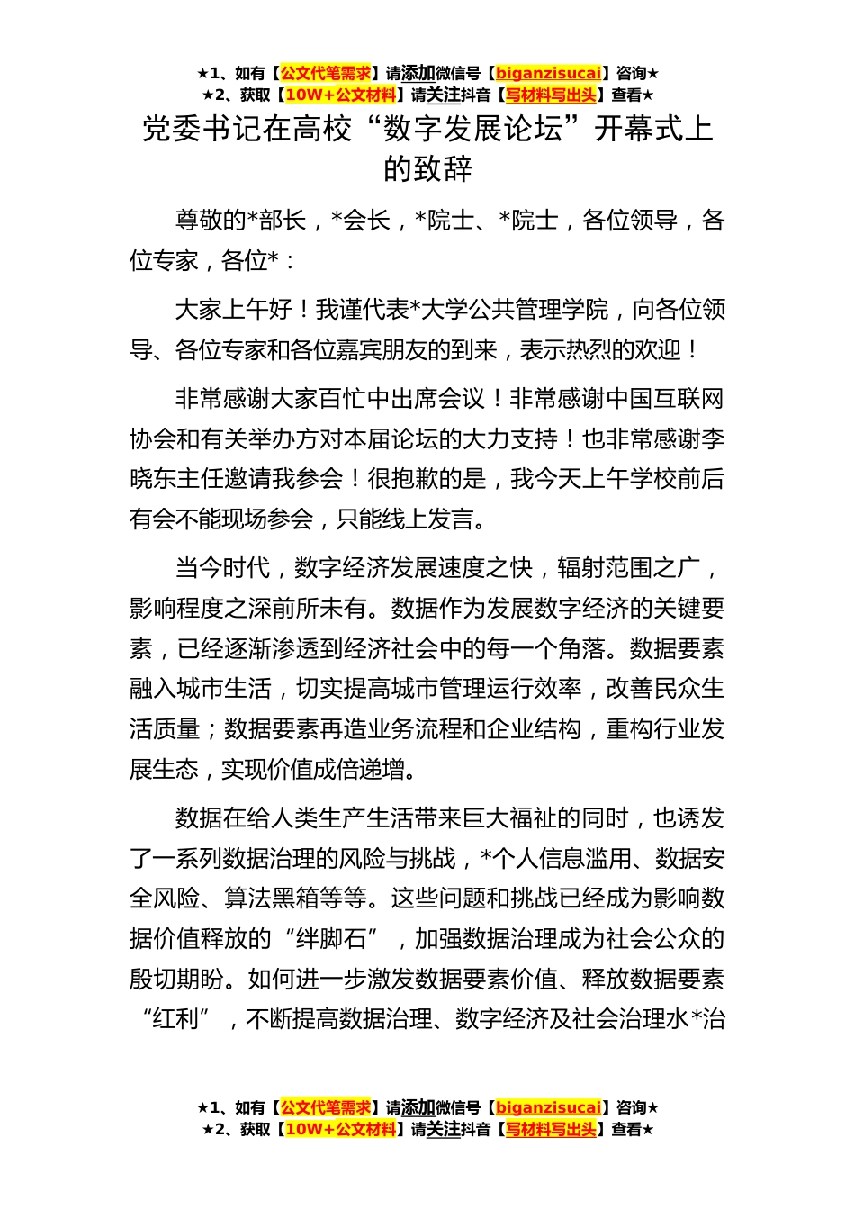 ★1、如有【公文代笔需求】请添加微信号【biganzisucai】咨询★★2、获取【10W+公文材料】请关注抖音【写材料写出头】查看★★1、如有【公文代笔需求】请添加微信号【biganzisucai】咨询★★2、获取【10W+公文材料】请关注抖音【写材料写出头】查看★★1、如有【公文代笔需求】请添加微信号【biganzisucai】咨询★★2、获取【10W+公文材料】请关注抖音【写材料写出头】查看★党委书记在高校“数字发展论坛”开幕式上的致辞尊敬的*部长,*会长,*院士、*院士,各位领导,各位专家,各位*:大家上午好!我谨代表*大学公共管理学院,向各位领导、各位专家和各位嘉宾朋友的到来,表示热烈的欢迎!非常感谢大家百忙中出席会议!非常感谢中国互联网协会和有关举办方对本届论坛的大力支持!也非常感谢李晓东主任邀请我参...