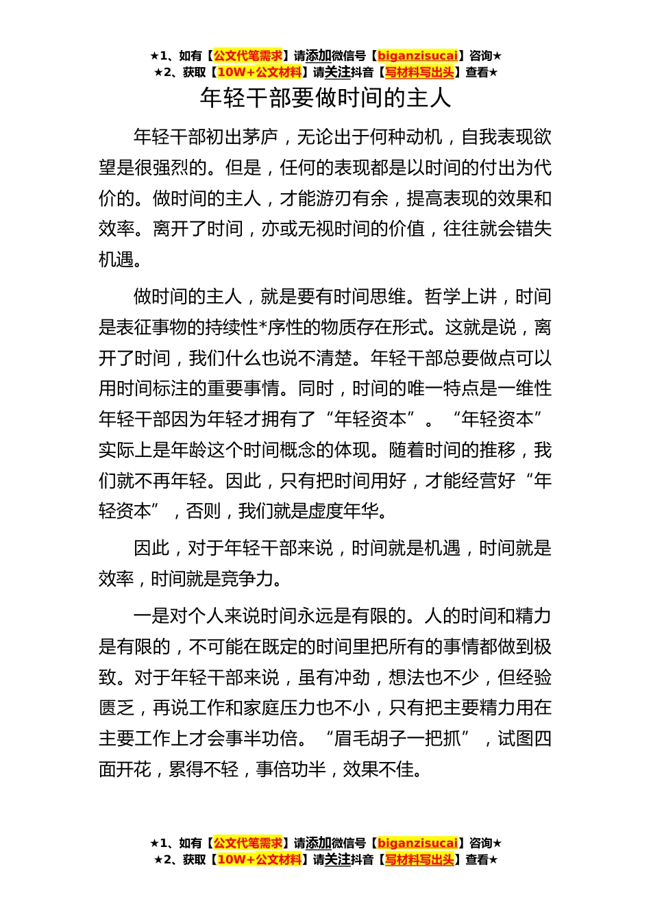 ★1、如有【公文代笔需求】请添加微信号【biganzisucai】咨询★★2、获取【10W+公文材料】请关注抖音【写材料写出头】查看★★1、如有【公文代笔需求】请添加微信号【biganzisucai】咨询★★2、获取【10W+公文材料】请关注抖音【写材料写出头】查看★★1、如有【公文代笔需求】请添加微信号【biganzisucai】咨询★★2、获取【10W+公文材料】请关注抖音【写材料写出头】查看★年轻干部要做时间的主人年轻干部初出茅庐,无论出于何种动机,自我表现欲望是很强烈的。但是,任何的表现都是以时间的付出为代价的。做时间的主人,才能游刃有余,提高表现的效果和效率。离开了时间,亦或无视时间的价值,往往就会错失机遇。做时间的主人,就是要有时间思维。哲学上讲,时间是表征事物的持续性*序性的物质存在形式。这就是...