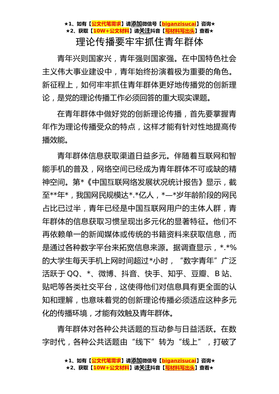 ★1、如有【公文代笔需求】请添加微信号【biganzisucai】咨询★★2、获取【10W+公文材料】请关注抖音【写材料写出头】查看★★1、如有【公文代笔需求】请添加微信号【biganzisucai】咨询★★2、获取【10W+公文材料】请关注抖音【写材料写出头】查看★★1、如有【公文代笔需求】请添加微信号【biganzisucai】咨询★★2、获取【10W+公文材料】请关注抖音【写材料写出头】查看★理论传播要牢牢抓住青年群体青年兴则国家兴,青年强则国家强。在中国特色社会主义伟大事业建设中,青年始终扮演着极为重要的角色。新征程上,如何牢牢抓住青年群体更好地传播党的创新理论,是党的理论传播工作必须回答的重大现实课题。在青年群体中做好党的创新理论传播,首先要掌握青年作为理论传播受众的特点,这样才能有针对性地提高传...