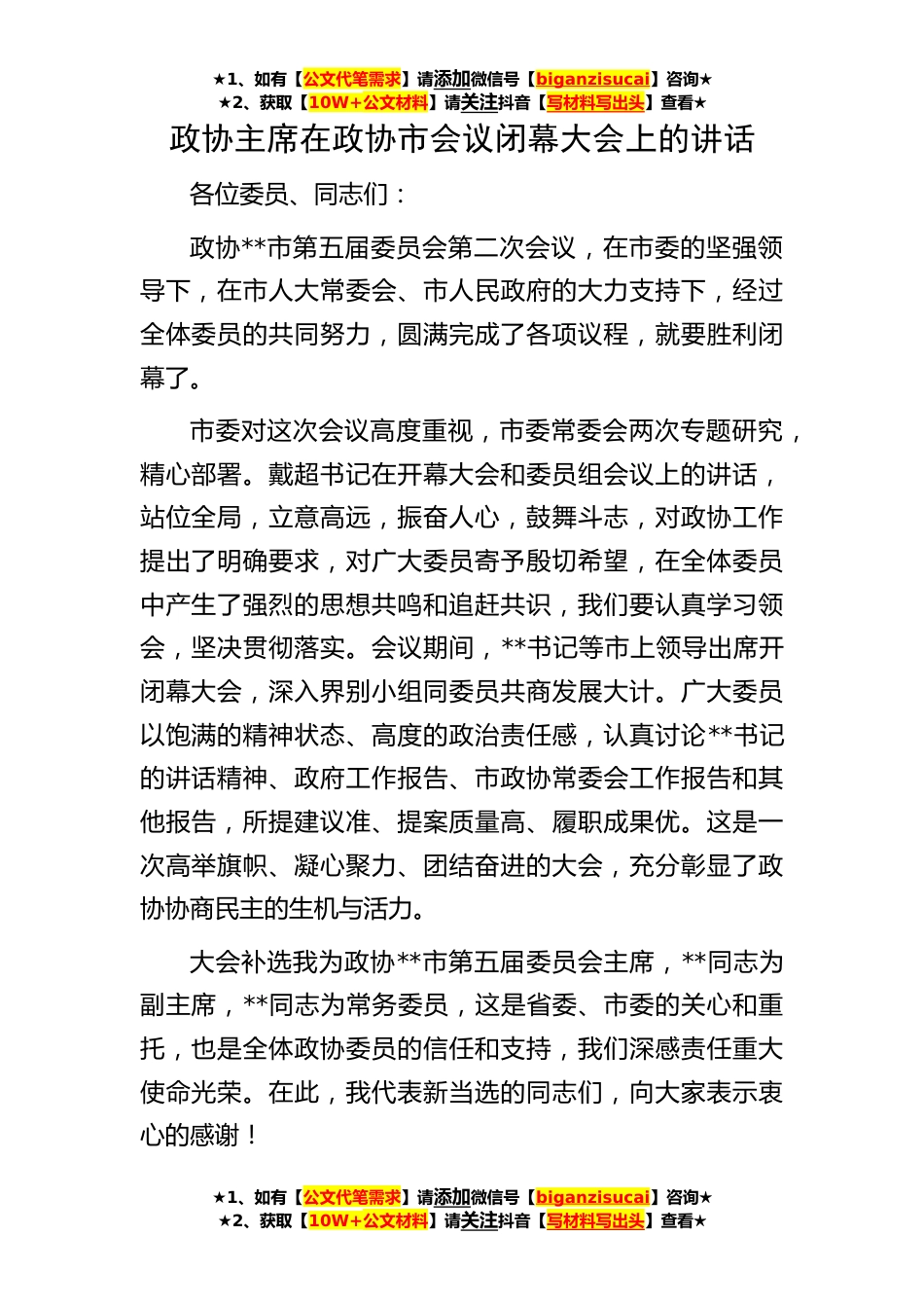 ★1、如有【公文代笔需求】请添加微信号【biganzisucai】咨询★★2、获取【10W+公文材料】请关注抖音【写材料写出头】查看★★1、如有【公文代笔需求】请添加微信号【biganzisucai】咨询★★2、获取【10W+公文材料】请关注抖音【写材料写出头】查看★★1、如有【公文代笔需求】请添加微信号【biganzisucai】咨询★★2、获取【10W+公文材料】请关注抖音【写材料写出头】查看★政协主席在政协市会议闭幕大会上的讲话各位委员、同志们:政协**市第五届委员会第二次会议,在市委的坚强领导下,在市人大常委会、市人民政府的大力支持下,经过全体委员的共同努力,圆满完成了各项议程,就要胜利闭幕了。市委对这次会议高度重视,市委常委会两次专题研究,精心部署。戴超书记在开幕大会和委员组会议上的讲话,站位全局,...
