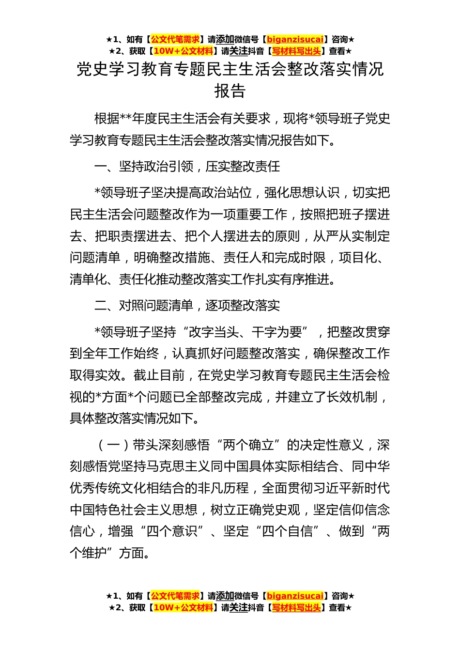 ★1、如有【公文代笔需求】请添加微信号【biganzisucai】咨询★★2、获取【10W+公文材料】请关注抖音【写材料写出头】查看★★1、如有【公文代笔需求】请添加微信号【biganzisucai】咨询★★2、获取【10W+公文材料】请关注抖音【写材料写出头】查看★★1、如有【公文代笔需求】请添加微信号【biganzisucai】咨询★★2、获取【10W+公文材料】请关注抖音【写材料写出头】查看★党史学习教育专题民主生活会整改落实情况报告根据**年度民主生活会有关要求,现将*领导班子党史学习教育专题民主生活会整改落实情况报告如下。一、坚持政治引领,压实整改责任*领导班子坚决提高政治站位,强化思想认识,切实把民主生活会问题整改作为一项重要工作,按照把班子摆进去、把职责摆进去、把个人摆进去的原则,从严从实制定问题...