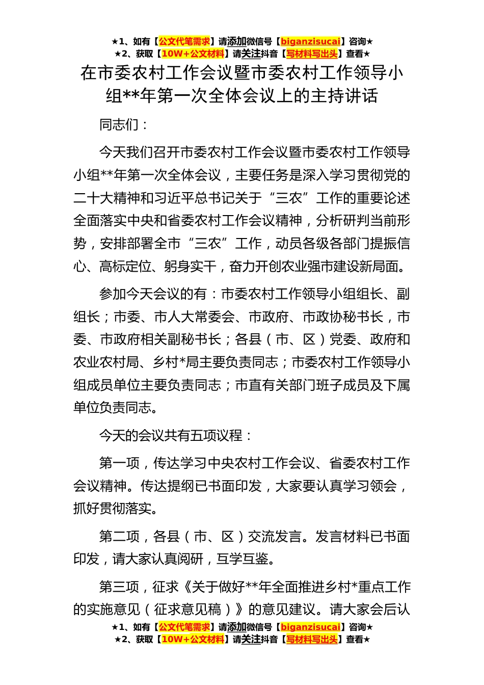 ★1、如有【公文代笔需求】请添加微信号【biganzisucai】咨询★★2、获取【10W+公文材料】请关注抖音【写材料写出头】查看★★1、如有【公文代笔需求】请添加微信号【biganzisucai】咨询★★2、获取【10W+公文材料】请关注抖音【写材料写出头】查看★★1、如有【公文代笔需求】请添加微信号【biganzisucai】咨询★★2、获取【10W+公文材料】请关注抖音【写材料写出头】查看★在市委农村工作会议暨市委农村工作领导小组**年第一次全体会议上的主持讲话同志们:今天我们召开市委农村工作会议暨市委农村工作领导小组**年第一次全体会议,主要任务是深入学习贯彻党的二十大精神和习近平总书记关于“三农”工作的重要论述全面落实中央和省委农村工作会议精神,分析研判当前形势,安排部署全市“三农”工作,动员各级各...