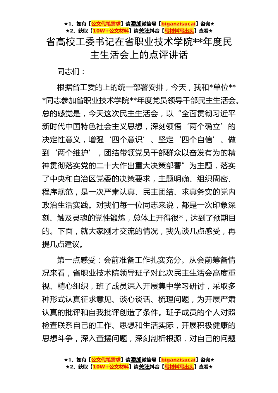 ★1、如有【公文代笔需求】请添加微信号【biganzisucai】咨询★★2、获取【10W+公文材料】请关注抖音【写材料写出头】查看★★1、如有【公文代笔需求】请添加微信号【biganzisucai】咨询★★2、获取【10W+公文材料】请关注抖音【写材料写出头】查看★★1、如有【公文代笔需求】请添加微信号【biganzisucai】咨询★★2、获取【10W+公文材料】请关注抖音【写材料写出头】查看★省高校工委书记在省职业技术学院**年度民主生活会上的点评讲话同志们:根据省工委的上的统一部署安排,今天,我和*单位***同志参加省职业技术学院**年度党员领导干部民主生活会。总的感觉是,今天这次民主生活会,以“全面贯彻习近平新时代中国特色社会主义思想,深刻领悟‘两个确立’的决定性意义,增强‘四个意识’、坚定‘四个自信’、...