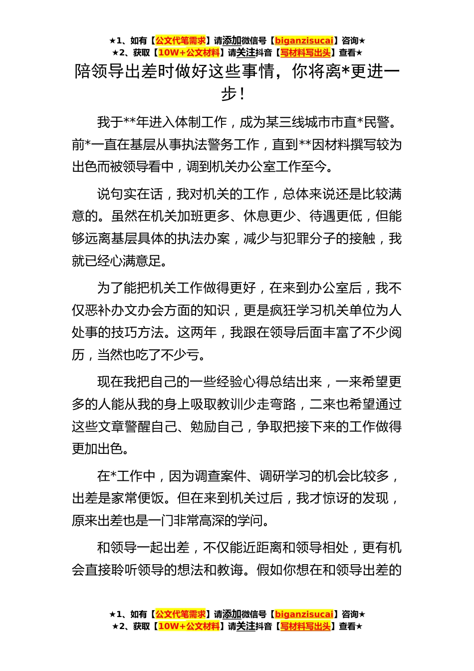 ★1、如有【公文代笔需求】请添加微信号【biganzisucai】咨询★★2、获取【10W+公文材料】请关注抖音【写材料写出头】查看★★1、如有【公文代笔需求】请添加微信号【biganzisucai】咨询★★2、获取【10W+公文材料】请关注抖音【写材料写出头】查看★★1、如有【公文代笔需求】请添加微信号【biganzisucai】咨询★★2、获取【10W+公文材料】请关注抖音【写材料写出头】查看★陪领导出差时做好这些事情,你将离*更进一步!我于**年进入体制工作,成为某三线城市市直*民警。前*一直在基层从事执法警务工作,直到**因材料撰写较为出色而被领导看中,调到机关办公室工作至今。说句实在话,我对机关的工作,总体来说还是比较满意的。虽然在机关加班更多、休息更少、待遇更低,但能够远离基层具体的执法办案,减少与犯罪...