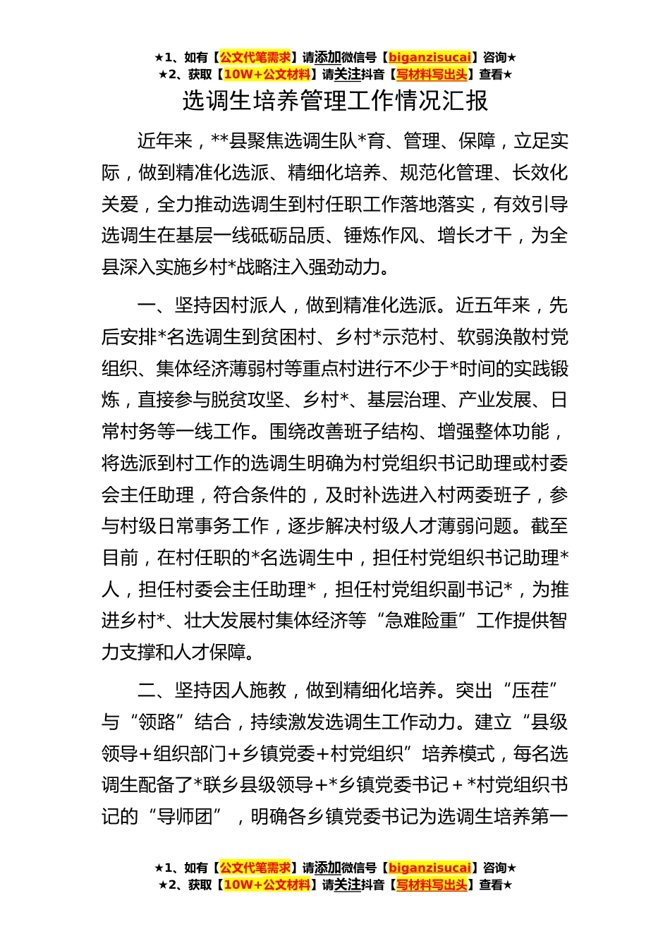 ★1、如有【公文代笔需求】请添加微信号【biganzisucai】咨询★★2、获取【10W+公文材料】请关注抖音【写材料写出头】查看★★1、如有【公文代笔需求】请添加微信号【biganzisucai】咨询★★2、获取【10W+公文材料】请关注抖音【写材料写出头】查看★★1、如有【公文代笔需求】请添加微信号【biganzisucai】咨询★★2、获取【10W+公文材料】请关注抖音【写材料写出头】查看★选调生培养管理工作情况汇报近年来,**县聚焦选调生队*育、管理、保障,立足实际,做到精准化选派、精细化培养、规范化管理、长效化关爱,全力推动选调生到村任职工作落地落实,有效引导选调生在基层一线砥砺品质、锤炼作风、增长才干,为全县深入实施乡村*战略注入强劲动力。一、坚持因村派人,做到精准化选派。近五年来,先后安排*名选调...