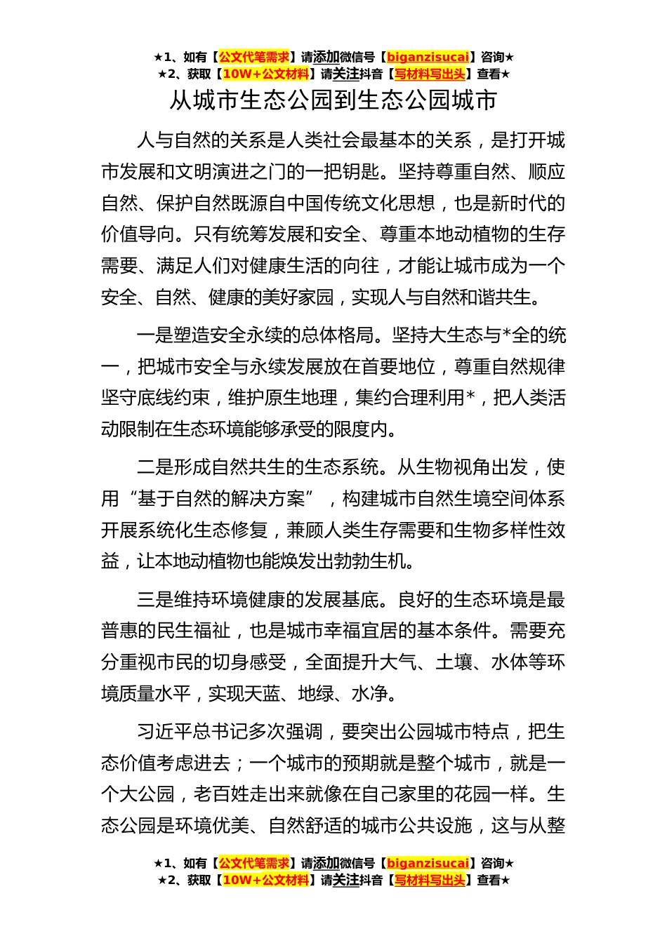 ★1、如有【公文代笔需求】请添加微信号【biganzisucai】咨询★★2、获取【10W+公文材料】请关注抖音【写材料写出头】查看★★1、如有【公文代笔需求】请添加微信号【biganzisucai】咨询★★2、获取【10W+公文材料】请关注抖音【写材料写出头】查看★★1、如有【公文代笔需求】请添加微信号【biganzisucai】咨询★★2、获取【10W+公文材料】请关注抖音【写材料写出头】查看★从城市生态公园到生态公园城市人与自然的关系是人类社会最基本的关系,是打开城市发展和文明演进之门的一把钥匙。坚持尊重自然、顺应自然、保护自然既源自中国传统文化思想,也是新时代的价值导向。只有统筹发展和安全、尊重本地动植物的生存需要、满足人们对健康生活的向往,才能让城市成为一个安全、自然、健康的美好家园,实现人与自然...