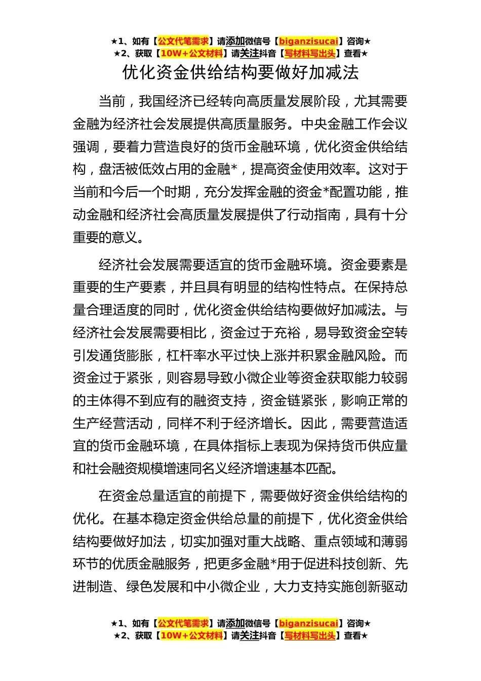 ★1、如有【公文代笔需求】请添加微信号【biganzisucai】咨询★★2、获取【10W+公文材料】请关注抖音【写材料写出头】查看★★1、如有【公文代笔需求】请添加微信号【biganzisucai】咨询★★2、获取【10W+公文材料】请关注抖音【写材料写出头】查看★★1、如有【公文代笔需求】请添加微信号【biganzisucai】咨询★★2、获取【10W+公文材料】请关注抖音【写材料写出头】查看★优化资金供给结构要做好加减法当前,我国经济已经转向高质量发展阶段,尤其需要金融为经济社会发展提供高质量服务。中央金融工作会议强调,要着力营造良好的货币金融环境,优化资金供给结构,盘活被低效占用的金融*,提高资金使用效率。这对于当前和今后一个时期,充分发挥金融的资金*配置功能,推动金融和经济社会高质量发展提供了行动指...