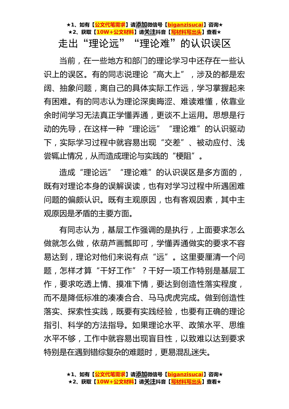★1、如有【公文代笔需求】请添加微信号【biganzisucai】咨询★★2、获取【10W+公文材料】请关注抖音【写材料写出头】查看★★1、如有【公文代笔需求】请添加微信号【biganzisucai】咨询★★2、获取【10W+公文材料】请关注抖音【写材料写出头】查看★★1、如有【公文代笔需求】请添加微信号【biganzisucai】咨询★★2、获取【10W+公文材料】请关注抖音【写材料写出头】查看★走出“理论远”“理论难”的认识误区当前,在一些地方和部门的理论学习中还存在一些认识上的误区。有的同志说理论“高大上”,涉及的都是宏阔、抽象问题,离自己的具体实际工作远,学习掌握起来有困难。有的同志认为理论深奥晦涩、难读难懂,依靠业余时间学习无法真正学懂弄通,更谈不上运用。思想是行动的先导,在这样一种“理论远”“理...