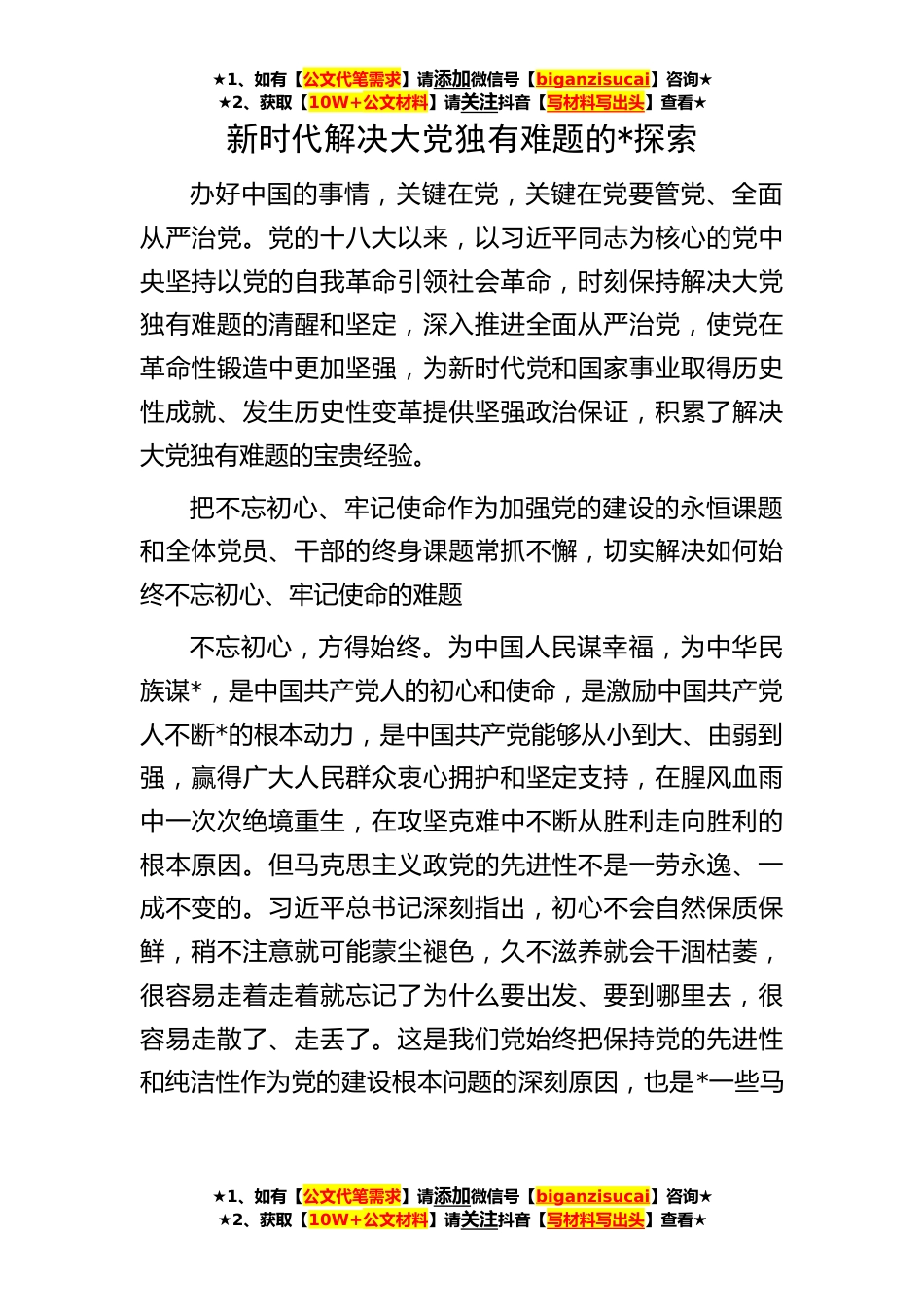★1、如有【公文代笔需求】请添加微信号【biganzisucai】咨询★★2、获取【10W+公文材料】请关注抖音【写材料写出头】查看★★1、如有【公文代笔需求】请添加微信号【biganzisucai】咨询★★2、获取【10W+公文材料】请关注抖音【写材料写出头】查看★★1、如有【公文代笔需求】请添加微信号【biganzisucai】咨询★★2、获取【10W+公文材料】请关注抖音【写材料写出头】查看★新时代解决大党独有难题的*探索办好中国的事情,关键在党,关键在党要管党、全面从严治党。党的十八大以来,以习近平同志为核心的党中央坚持以党的自我革命引领社会革命,时刻保持解决大党独有难题的清醒和坚定,深入推进全面从严治党,使党在革命性锻造中更加坚强,为新时代党和国家事业取得历史性成就、发生历史性变革提供坚强政治保证,...
