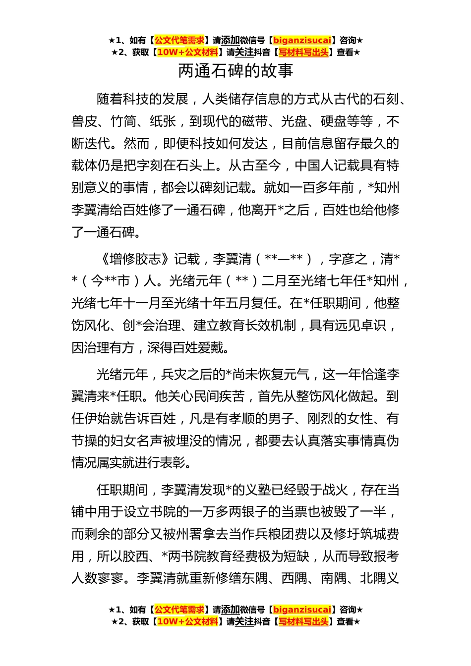 ★1、如有【公文代笔需求】请添加微信号【biganzisucai】咨询★★2、获取【10W+公文材料】请关注抖音【写材料写出头】查看★★1、如有【公文代笔需求】请添加微信号【biganzisucai】咨询★★2、获取【10W+公文材料】请关注抖音【写材料写出头】查看★★1、如有【公文代笔需求】请添加微信号【biganzisucai】咨询★★2、获取【10W+公文材料】请关注抖音【写材料写出头】查看★两通石碑的故事随着科技的发展,人类储存信息的方式从古代的石刻、兽皮、竹简、纸张,到现代的磁带、光盘、硬盘等等,不断迭代。然而,即便科技如何发达,目前信息留存最久的载体仍是把字刻在石头上。从古至今,中国人记载具有特别意义的事情,都会以碑刻记载。就如一百多年前,*知州李翼清给百姓修了一通石碑,他离开*之后,百姓也给他修...
