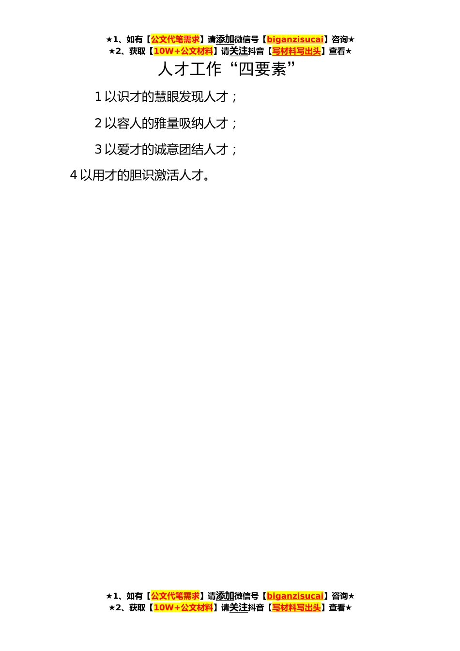 ★1、如有【公文代笔需求】请添加微信号【biganzisucai】咨询★★2、获取【10W+公文材料】请关注抖音【写材料写出头】查看★★1、如有【公文代笔需求】请添加微信号【biganzisucai】咨询★★2、获取【10W+公文材料】请关注抖音【写材料写出头】查看★★1、如有【公文代笔需求】请添加微信号【biganzisucai】咨询★★2、获取【10W+公文材料】请关注抖音【写材料写出头】查看★人才工作“四要素”1以识才的慧眼发现人才;2以容人的雅量吸纳人才;3以爱才的诚意团结人才;4以用才的胆识激活人才。★1、如有【公文代笔需求】请添加微信号【biganzisucai】咨询★★2、获取【10W+公文材料】请关注抖音【写材料写出头】查看★★1、如有【公文代笔需求】请添加微信号【biganzisucai】咨询★★2、获取【10W+公文材料】请关...