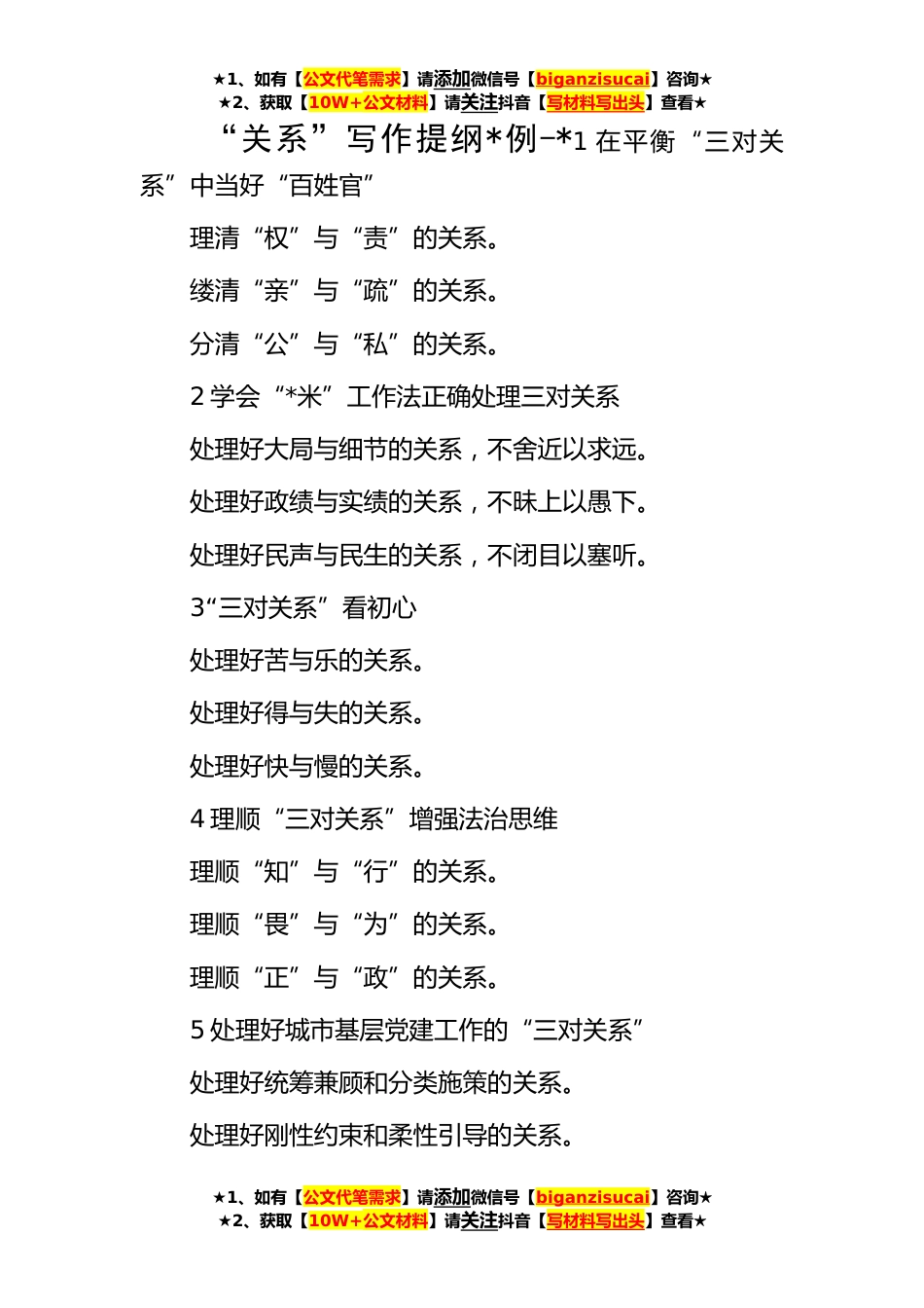 ★1、如有【公文代笔需求】请添加微信号【biganzisucai】咨询★★2、获取【10W+公文材料】请关注抖音【写材料写出头】查看★★1、如有【公文代笔需求】请添加微信号【biganzisucai】咨询★★2、获取【10W+公文材料】请关注抖音【写材料写出头】查看★★1、如有【公文代笔需求】请添加微信号【biganzisucai】咨询★★2、获取【10W+公文材料】请关注抖音【写材料写出头】查看★“关系”写作提纲*例-*1在平衡“三对关系”中当好“百姓官”理清“权”与“责”的关系。缕清“亲”与“疏”的关系。分清“公”与“私”的关系。2学会“*米”工作法正确处理三对关系处理好大局与细节的关系,不舍近以求远。处理好政绩与实绩的关系,不昧上以愚下。处理好民声与民生的关系,不闭目以塞听。3“三对关系”看初心处理好苦与乐的...