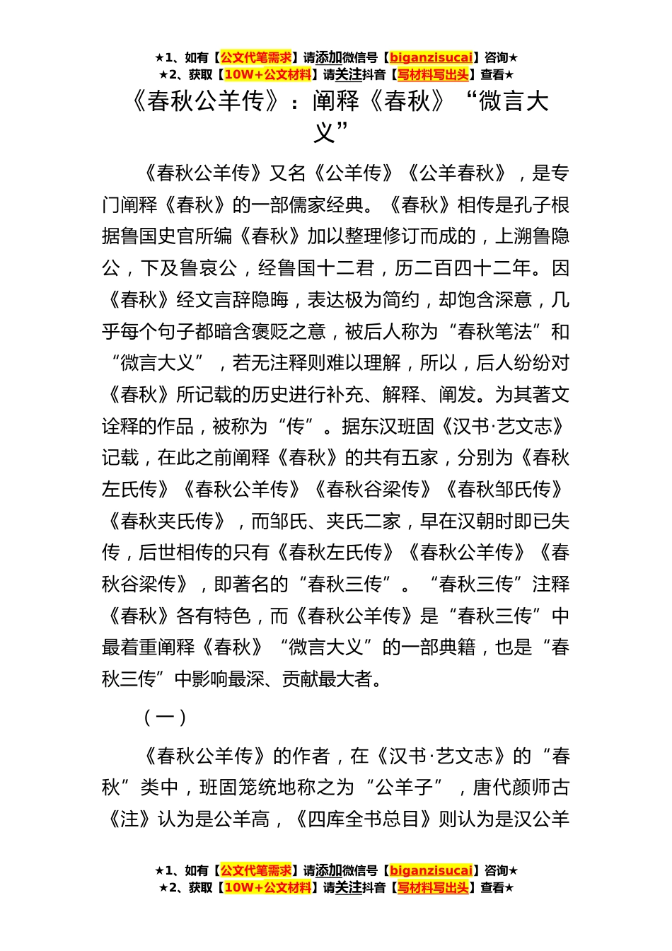 ★1、如有【公文代笔需求】请添加微信号【biganzisucai】咨询★★2、获取【10W+公文材料】请关注抖音【写材料写出头】查看★★1、如有【公文代笔需求】请添加微信号【biganzisucai】咨询★★2、获取【10W+公文材料】请关注抖音【写材料写出头】查看★★1、如有【公文代笔需求】请添加微信号【biganzisucai】咨询★★2、获取【10W+公文材料】请关注抖音【写材料写出头】查看★《春秋公羊传》:阐释《春秋》“微言大义”《春秋公羊传》又名《公羊传》《公羊春秋》,是专门阐释《春秋》的一部儒家经典。《春秋》相传是孔子根据鲁国史官所编《春秋》加以整理修订而成的,上溯鲁隐公,下及鲁哀公,经鲁国十二君,历二百四十二年。因《春秋》经文言辞隐晦,表达极为简约,却饱含深意,几乎每个句子都暗含褒贬之意,被后...