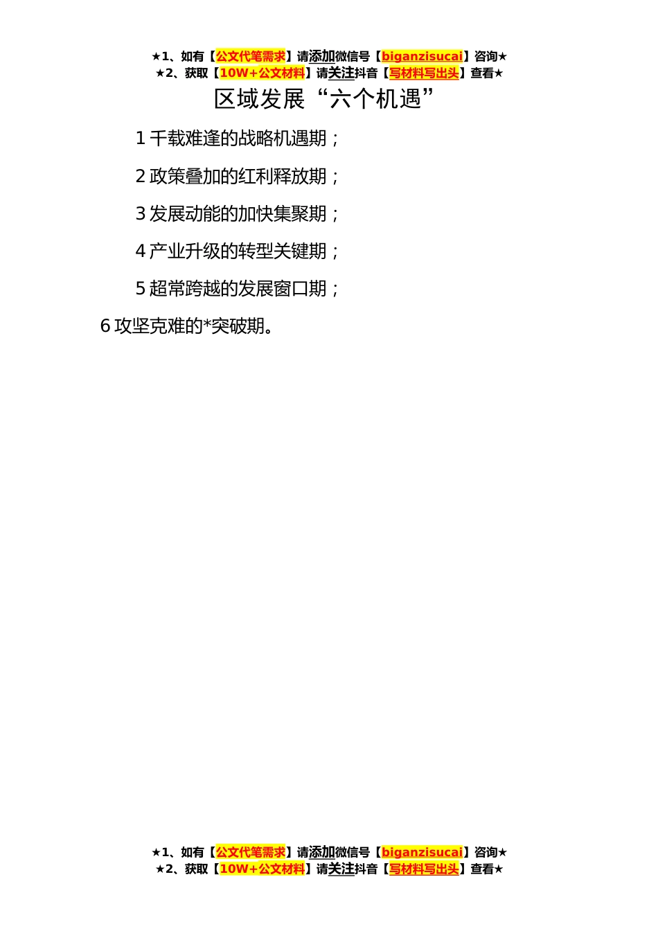 ★1、如有【公文代笔需求】请添加微信号【biganzisucai】咨询★★2、获取【10W+公文材料】请关注抖音【写材料写出头】查看★★1、如有【公文代笔需求】请添加微信号【biganzisucai】咨询★★2、获取【10W+公文材料】请关注抖音【写材料写出头】查看★★1、如有【公文代笔需求】请添加微信号【biganzisucai】咨询★★2、获取【10W+公文材料】请关注抖音【写材料写出头】查看★区域发展“六个机遇”1千载难逢的战略机遇期;2政策叠加的红利释放期;3发展动能的加快集聚期;4产业升级的转型关键期;5超常跨越的发展窗口期;6攻坚克难的*突破期。★1、如有【公文代笔需求】请添加微信号【biganzisucai】咨询★★2、获取【10W+公文材料】请关注抖音【写材料写出头】查看★★1、如有【公文代笔需求】请添加微信号【bigan...