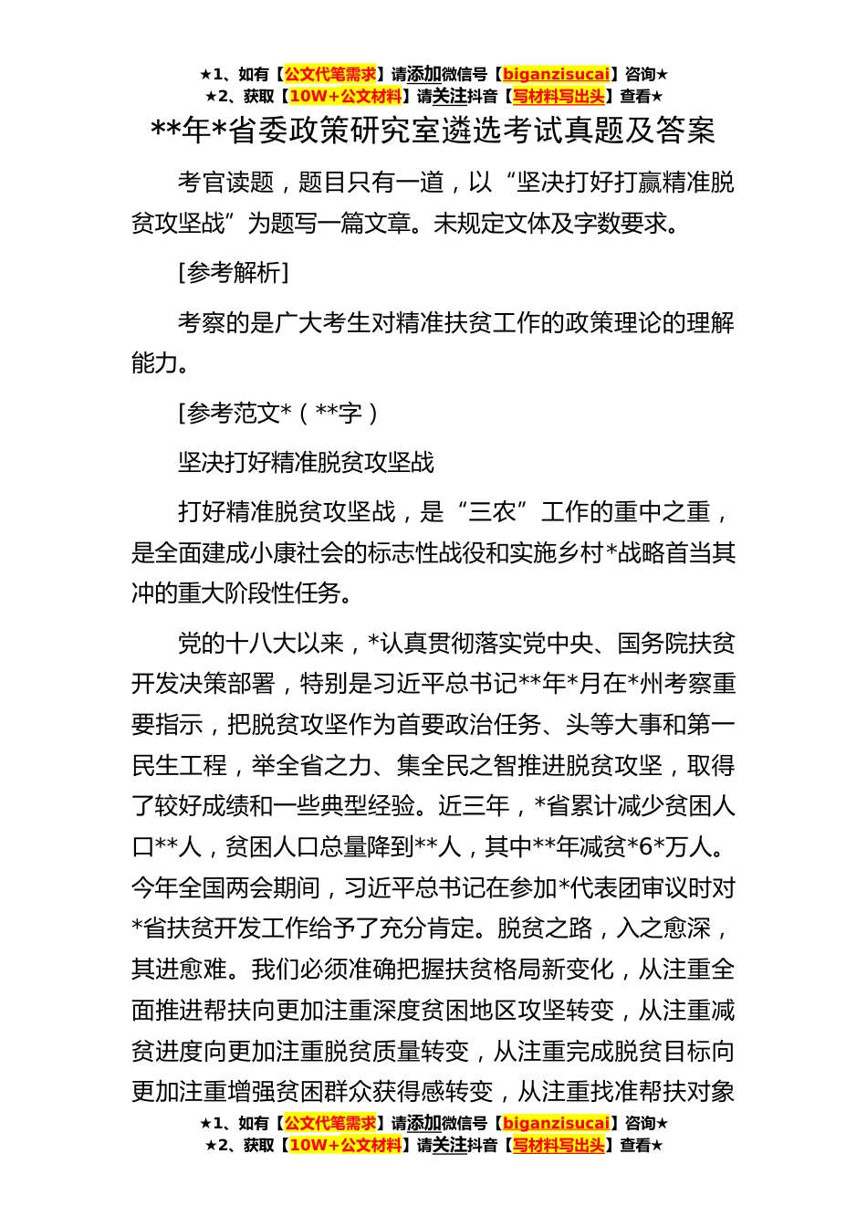 ★1、如有【公文代笔需求】请添加微信号【biganzisucai】咨询★★2、获取【10W+公文材料】请关注抖音【写材料写出头】查看★★1、如有【公文代笔需求】请添加微信号【biganzisucai】咨询★★2、获取【10W+公文材料】请关注抖音【写材料写出头】查看★★1、如有【公文代笔需求】请添加微信号【biganzisucai】咨询★★2、获取【10W+公文材料】请关注抖音【写材料写出头】查看★**年*省委政策研究室遴选考试真题及答案考官读题,题目只有一道,以“坚决打好打赢精准脱贫攻坚战”为题写一篇文章。未规定文体及字数要求。[参考解析]考察的是广大考生对精准扶贫工作的政策理论的理解能力。[参考范文*(**字)坚决打好精准脱贫攻坚战打好精准脱贫攻坚战,是“三农”工作的重中之重,是全面建成小康社会的标志性战役和实施...