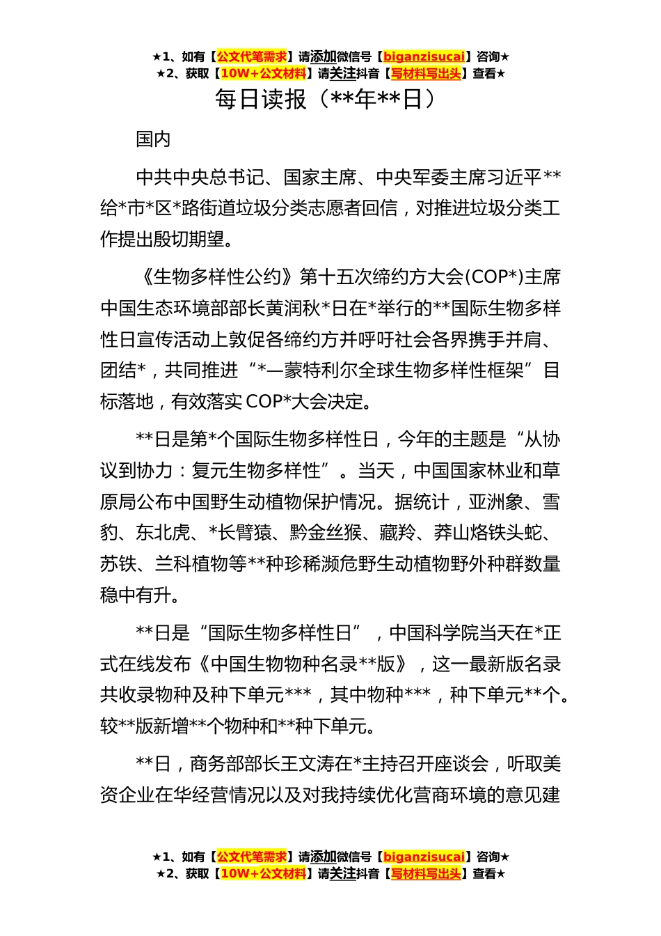 ★1、如有【公文代笔需求】请添加微信号【biganzisucai】咨询★★2、获取【10W+公文材料】请关注抖音【写材料写出头】查看★★1、如有【公文代笔需求】请添加微信号【biganzisucai】咨询★★2、获取【10W+公文材料】请关注抖音【写材料写出头】查看★★1、如有【公文代笔需求】请添加微信号【biganzisucai】咨询★★2、获取【10W+公文材料】请关注抖音【写材料写出头】查看★每日读报(**年**日)国内中共中央总书记、国家主席、中央军委主席习近平**给*市*区*路街道垃圾分类志愿者回信,对推进垃圾分类工作提出殷切期望。《生物多样性公约》第十五次缔约方大会(COP*)主席中国生态环境部部长黄润秋*日在*举行的**国际生物多样性日宣传活动上敦促各缔约方并呼吁社会各界携手并肩、团结*,共同推进“*—蒙特利尔全球...