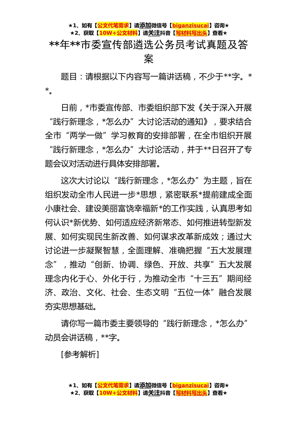 ★1、如有【公文代笔需求】请添加微信号【biganzisucai】咨询★★2、获取【10W+公文材料】请关注抖音【写材料写出头】查看★★1、如有【公文代笔需求】请添加微信号【biganzisucai】咨询★★2、获取【10W+公文材料】请关注抖音【写材料写出头】查看★★1、如有【公文代笔需求】请添加微信号【biganzisucai】咨询★★2、获取【10W+公文材料】请关注抖音【写材料写出头】查看★**年**市委宣传部遴选公务员考试真题及答案题目:请根据以下内容写一篇讲话稿,不少于**字。**。日前,*市委宣传部、市委组织部下发《关于深入开展“践行新理念,*怎么办”大讨论活动的通知》,要求结合全市“两学一做”学习教育的安排部署,在全市组织开展“践行新理念,*怎么办”大讨论活动,并于**日召开了专题会议对活动进行具体安排部...
