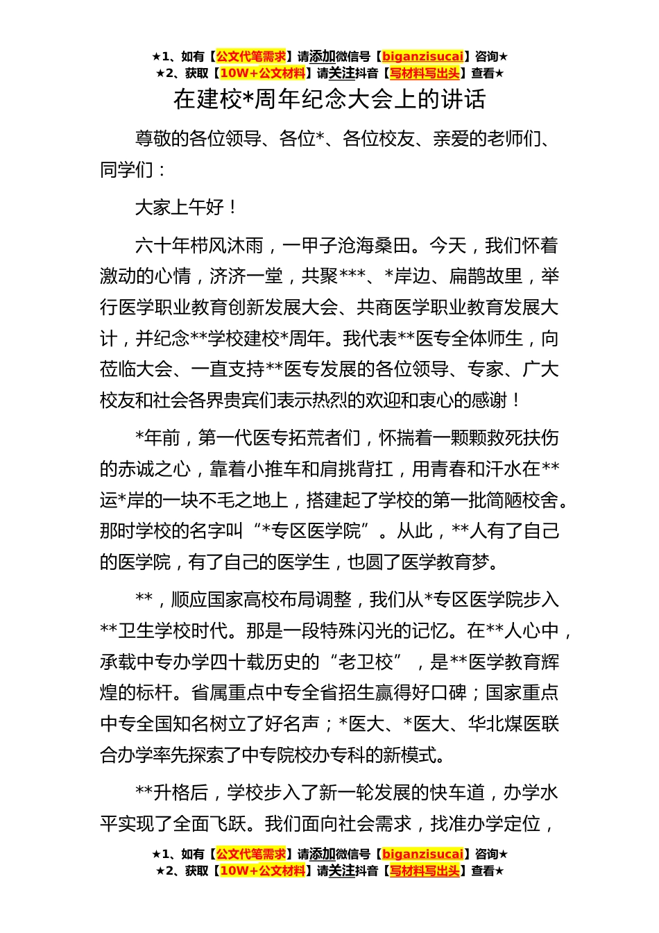 ★1、如有【公文代笔需求】请添加微信号【biganzisucai】咨询★★2、获取【10W+公文材料】请关注抖音【写材料写出头】查看★★1、如有【公文代笔需求】请添加微信号【biganzisucai】咨询★★2、获取【10W+公文材料】请关注抖音【写材料写出头】查看★★1、如有【公文代笔需求】请添加微信号【biganzisucai】咨询★★2、获取【10W+公文材料】请关注抖音【写材料写出头】查看★在建校*周年纪念大会上的讲话尊敬的各位领导、各位*、各位校友、亲爱的老师们、同学们:大家上午好!六十年栉风沐雨,一甲子沧海桑田。今天,我们怀着激动的心情,济济一堂,共聚***、*岸边、扁鹊故里,举行医学职业教育创新发展大会、共商医学职业教育发展大计,并纪念**学校建校*周年。我代表**医专全体师生,向莅临大会、一直支持**医专...