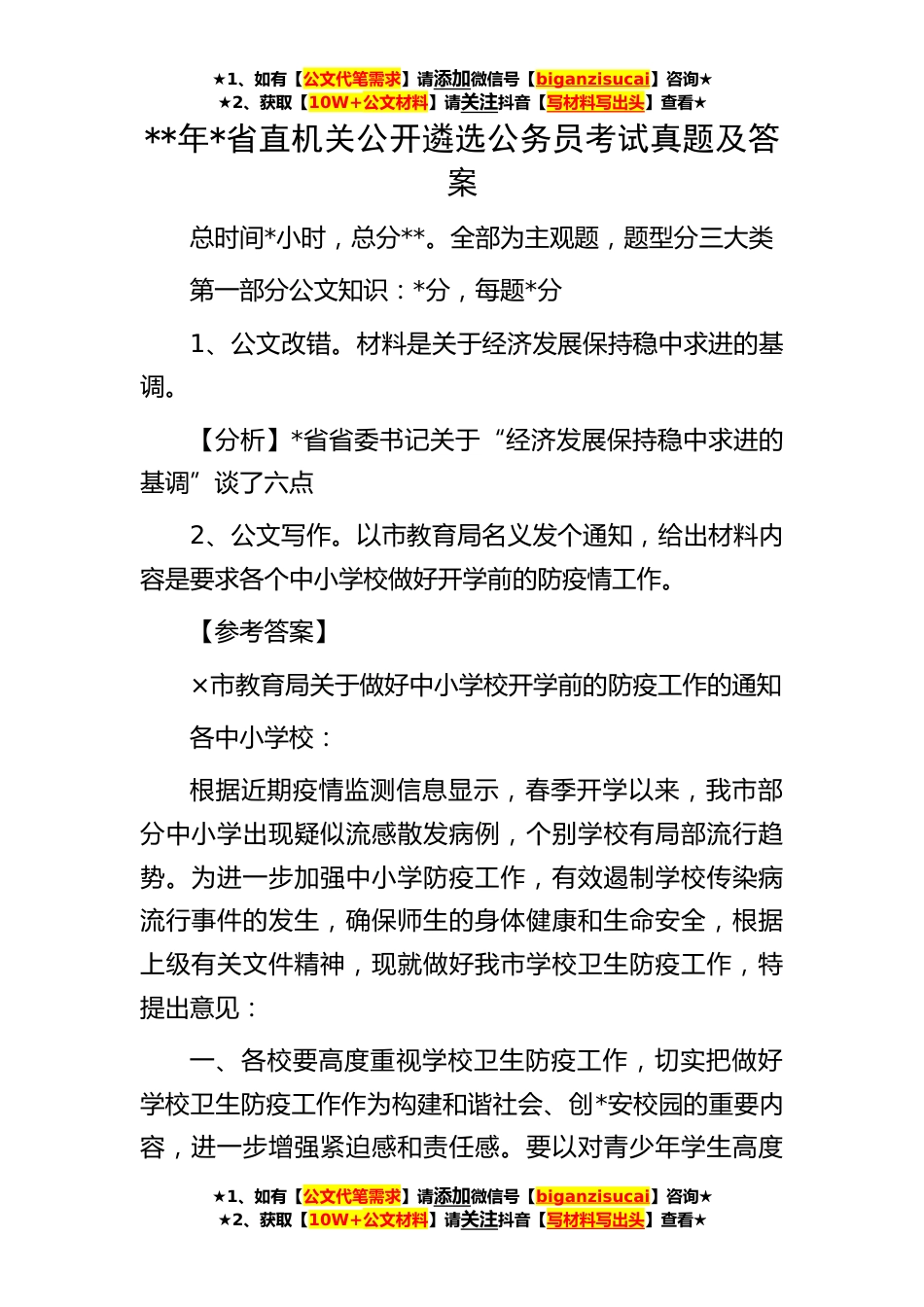 ★1、如有【公文代笔需求】请添加微信号【biganzisucai】咨询★★2、获取【10W+公文材料】请关注抖音【写材料写出头】查看★★1、如有【公文代笔需求】请添加微信号【biganzisucai】咨询★★2、获取【10W+公文材料】请关注抖音【写材料写出头】查看★★1、如有【公文代笔需求】请添加微信号【biganzisucai】咨询★★2、获取【10W+公文材料】请关注抖音【写材料写出头】查看★**年*省直机关公开遴选公务员考试真题及答案总时间*小时,总分**。全部为主观题,题型分三大类第一部分公文知识:*分,每题*分1、公文改错。材料是关于经济发展保持稳中求进的基调。【分析】*省省委书记关于“经济发展保持稳中求进的基调”谈了六点2、公文写作。以市教育局名义发个通知,给出材料内容是要求各个中小学校做好开学前的防疫情...
