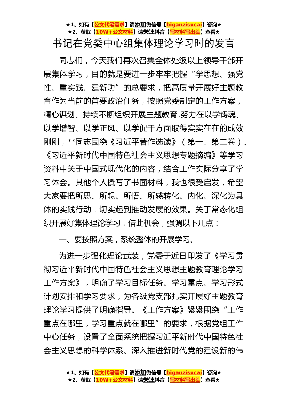 ★1、如有【公文代笔需求】请添加微信号【biganzisucai】咨询★★2、获取【10W+公文材料】请关注抖音【写材料写出头】查看★★1、如有【公文代笔需求】请添加微信号【biganzisucai】咨询★★2、获取【10W+公文材料】请关注抖音【写材料写出头】查看★★1、如有【公文代笔需求】请添加微信号【biganzisucai】咨询★★2、获取【10W+公文材料】请关注抖音【写材料写出头】查看★书记在党委中心组集体理论学习时的发言同志们,今天我们再次召集全体处级以上领导干部开展集体学习,目的就是要进一步牢牢把握“学思想、强党性、重实践、建新功”的总要求,把高质量开展好主题教育作为当前的首要政治任务,按照党委制定的工作方案,精心谋划、持续不断组织开展主题教育,努力在以学铸魂、以学增智、以学正风、以学促干方面...