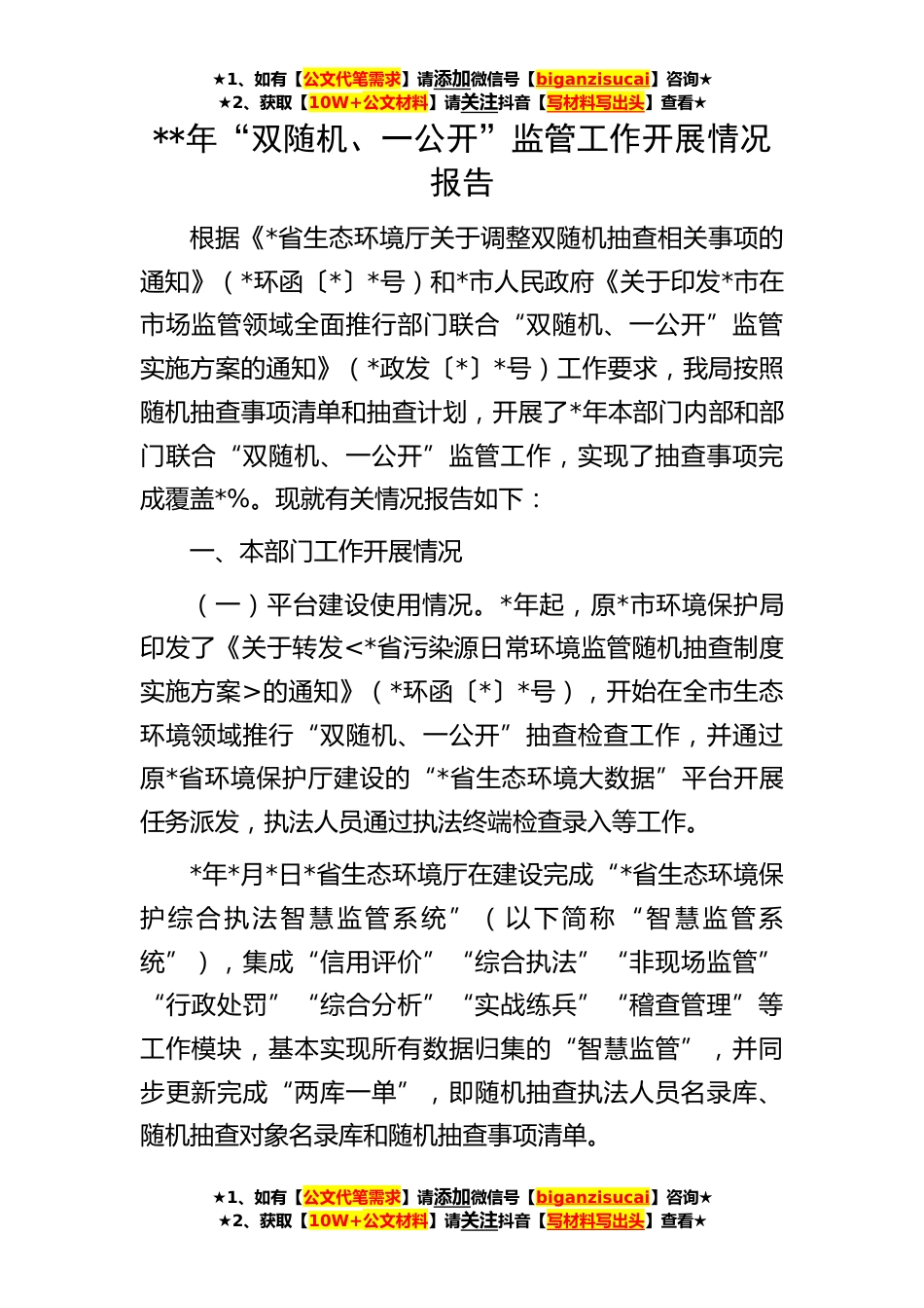 ★1、如有【公文代笔需求】请添加微信号【biganzisucai】咨询★★2、获取【10W+公文材料】请关注抖音【写材料写出头】查看★★1、如有【公文代笔需求】请添加微信号【biganzisucai】咨询★★2、获取【10W+公文材料】请关注抖音【写材料写出头】查看★★1、如有【公文代笔需求】请添加微信号【biganzisucai】咨询★★2、获取【10W+公文材料】请关注抖音【写材料写出头】查看★**年“双随机、一公开”监管工作开展情况报告根据《*省生态环境厅关于调整双随机抽查相关事项的通知》(*环函〔*〕*号)和*市人民政府《关于印发*市在市场监管领域全面推行部门联合“双随机、一公开”监管实施方案的通知》(*政发〔*〕*号)工作要求,我局按照随机抽查事项清单和抽查计划,开展了*年本部门内部和部门联合“双随机、一公开...