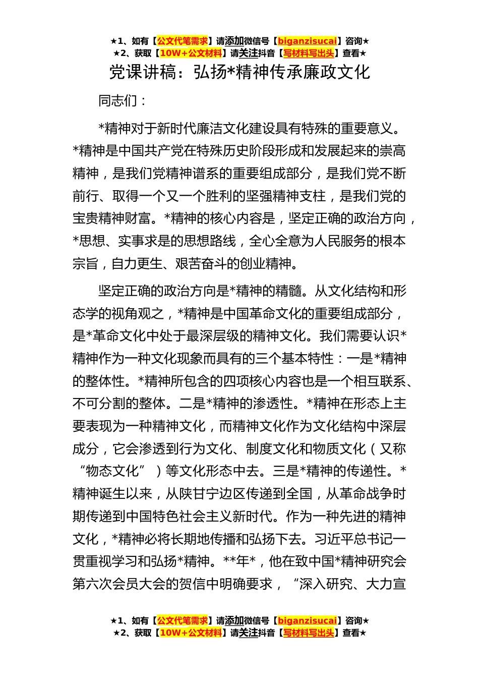 ★1、如有【公文代笔需求】请添加微信号【biganzisucai】咨询★★2、获取【10W+公文材料】请关注抖音【写材料写出头】查看★★1、如有【公文代笔需求】请添加微信号【biganzisucai】咨询★★2、获取【10W+公文材料】请关注抖音【写材料写出头】查看★★1、如有【公文代笔需求】请添加微信号【biganzisucai】咨询★★2、获取【10W+公文材料】请关注抖音【写材料写出头】查看★党课讲稿:弘扬*精神传承廉政文化同志们:*精神对于新时代廉洁文化建设具有特殊的重要意义。*精神是中国共产党在特殊历史阶段形成和发展起来的崇高精神,是我们党精神谱系的重要组成部分,是我们党不断前行、取得一个又一个胜利的坚强精神支柱,是我们党的宝贵精神财富。*精神的核心内容是,坚定正确的政治方向,*思想、实事求是的思想路线...