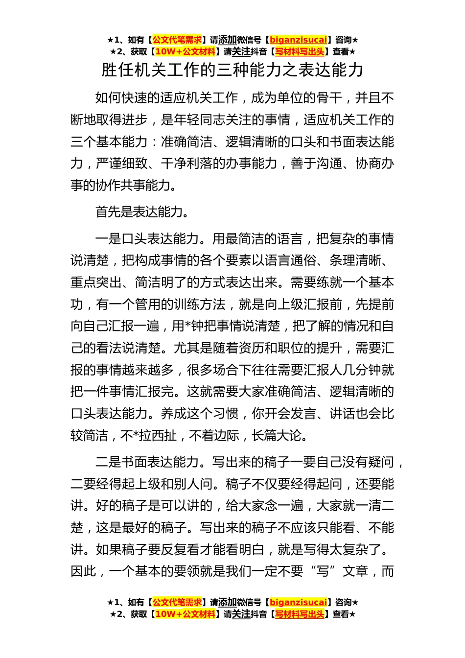 ★1、如有【公文代笔需求】请添加微信号【biganzisucai】咨询★★2、获取【10W+公文材料】请关注抖音【写材料写出头】查看★★1、如有【公文代笔需求】请添加微信号【biganzisucai】咨询★★2、获取【10W+公文材料】请关注抖音【写材料写出头】查看★★1、如有【公文代笔需求】请添加微信号【biganzisucai】咨询★★2、获取【10W+公文材料】请关注抖音【写材料写出头】查看★胜任机关工作的三种能力之表达能力如何快速的适应机关工作,成为单位的骨干,并且不断地取得进步,是年轻同志关注的事情,适应机关工作的三个基本能力:准确简洁、逻辑清晰的口头和书面表达能力,严谨细致、干净利落的办事能力,善于沟通、协商办事的协作共事能力。首先是表达能力。一是口头表达能力。用最简洁的语言,把复杂的事情说清楚...