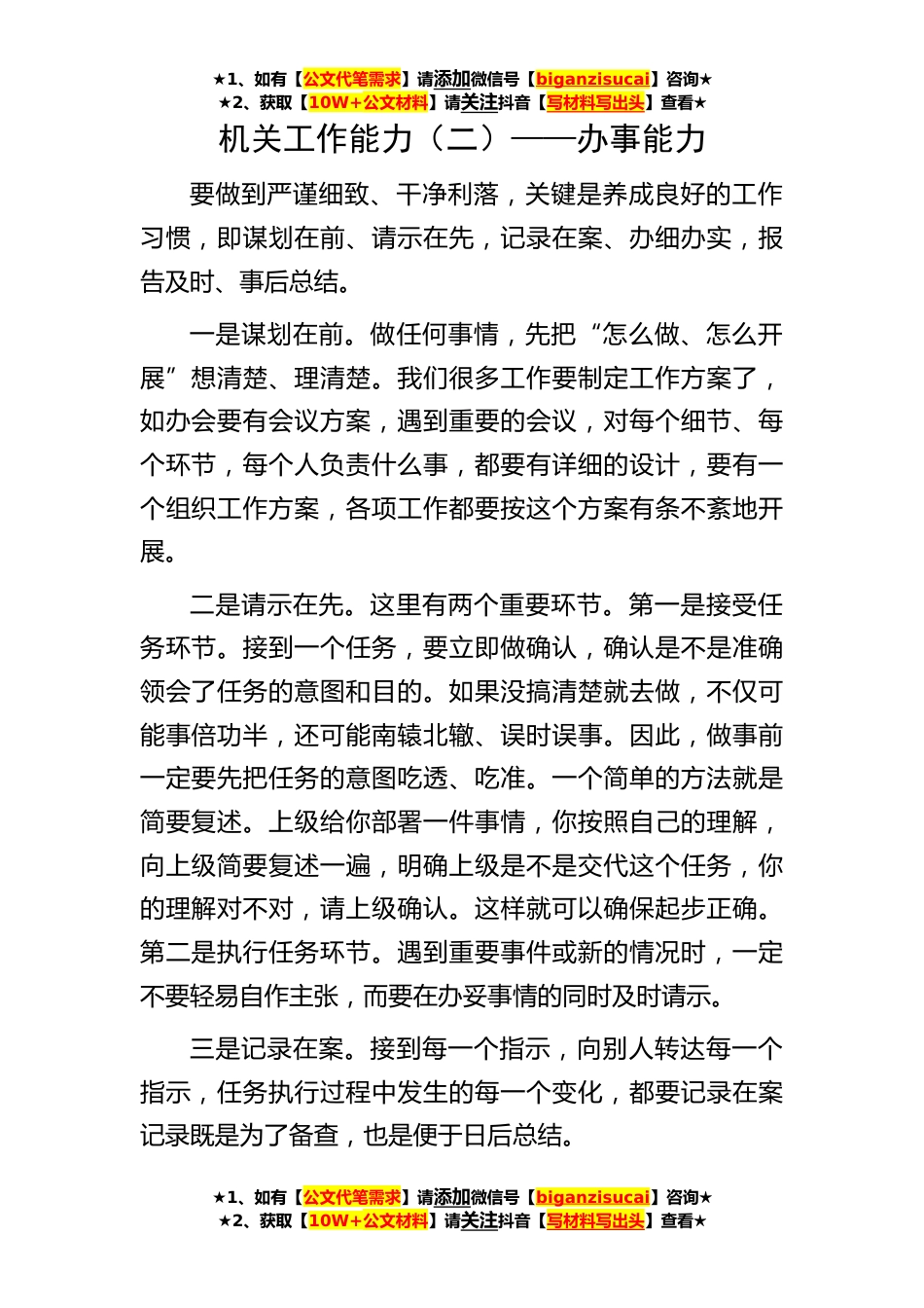★1、如有【公文代笔需求】请添加微信号【biganzisucai】咨询★★2、获取【10W+公文材料】请关注抖音【写材料写出头】查看★★1、如有【公文代笔需求】请添加微信号【biganzisucai】咨询★★2、获取【10W+公文材料】请关注抖音【写材料写出头】查看★★1、如有【公文代笔需求】请添加微信号【biganzisucai】咨询★★2、获取【10W+公文材料】请关注抖音【写材料写出头】查看★机关工作能力(二)——办事能力要做到严谨细致、干净利落,关键是养成良好的工作习惯,即谋划在前、请示在先,记录在案、办细办实,报告及时、事后总结。一是谋划在前。做任何事情,先把“怎么做、怎么开展”想清楚、理清楚。我们很多工作要制定工作方案了,如办会要有会议方案,遇到重要的会议,对每个细节、每个环节,每个人负责什么事...