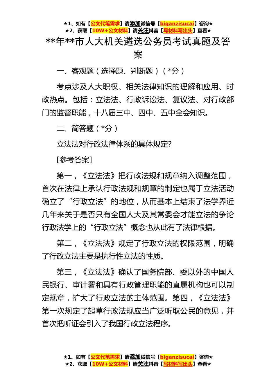 ★1、如有【公文代笔需求】请添加微信号【biganzisucai】咨询★★2、获取【10W+公文材料】请关注抖音【写材料写出头】查看★★1、如有【公文代笔需求】请添加微信号【biganzisucai】咨询★★2、获取【10W+公文材料】请关注抖音【写材料写出头】查看★★1、如有【公文代笔需求】请添加微信号【biganzisucai】咨询★★2、获取【10W+公文材料】请关注抖音【写材料写出头】查看★**年**市人大机关遴选公务员考试真题及答案一、客观题(选择题、判断题)(*分)考点涉及人大职权、相关法律知识的理解和应用、时政热点。包括:立法法、行政诉讼法、复议法、对行政部门的监督职能,十八届三中、四中、五中全会知识。二、简答题(*分)立法法对行政法律体系的具体规定?[参考答案]第一,《立法法》把行政法规和规章纳入调整...