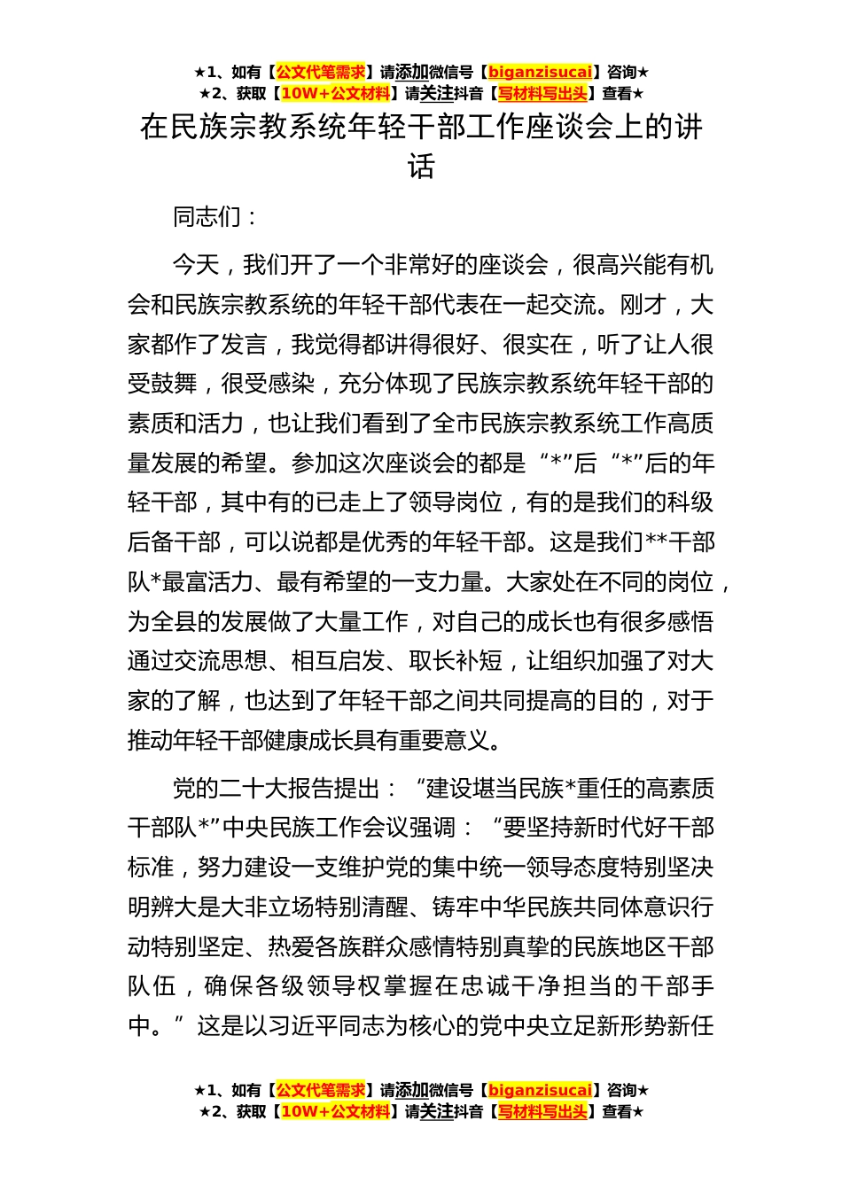 ★1、如有【公文代笔需求】请添加微信号【biganzisucai】咨询★★2、获取【10W+公文材料】请关注抖音【写材料写出头】查看★★1、如有【公文代笔需求】请添加微信号【biganzisucai】咨询★★2、获取【10W+公文材料】请关注抖音【写材料写出头】查看★★1、如有【公文代笔需求】请添加微信号【biganzisucai】咨询★★2、获取【10W+公文材料】请关注抖音【写材料写出头】查看★在民族宗教系统年轻干部工作座谈会上的讲话同志们:今天,我们开了一个非常好的座谈会,很高兴能有机会和民族宗教系统的年轻干部代表在一起交流。刚才,大家都作了发言,我觉得都讲得很好、很实在,听了让人很受鼓舞,很受感染,充分体现了民族宗教系统年轻干部的素质和活力,也让我们看到了全市民族宗教系统工作高质量发展的希望。参加这...