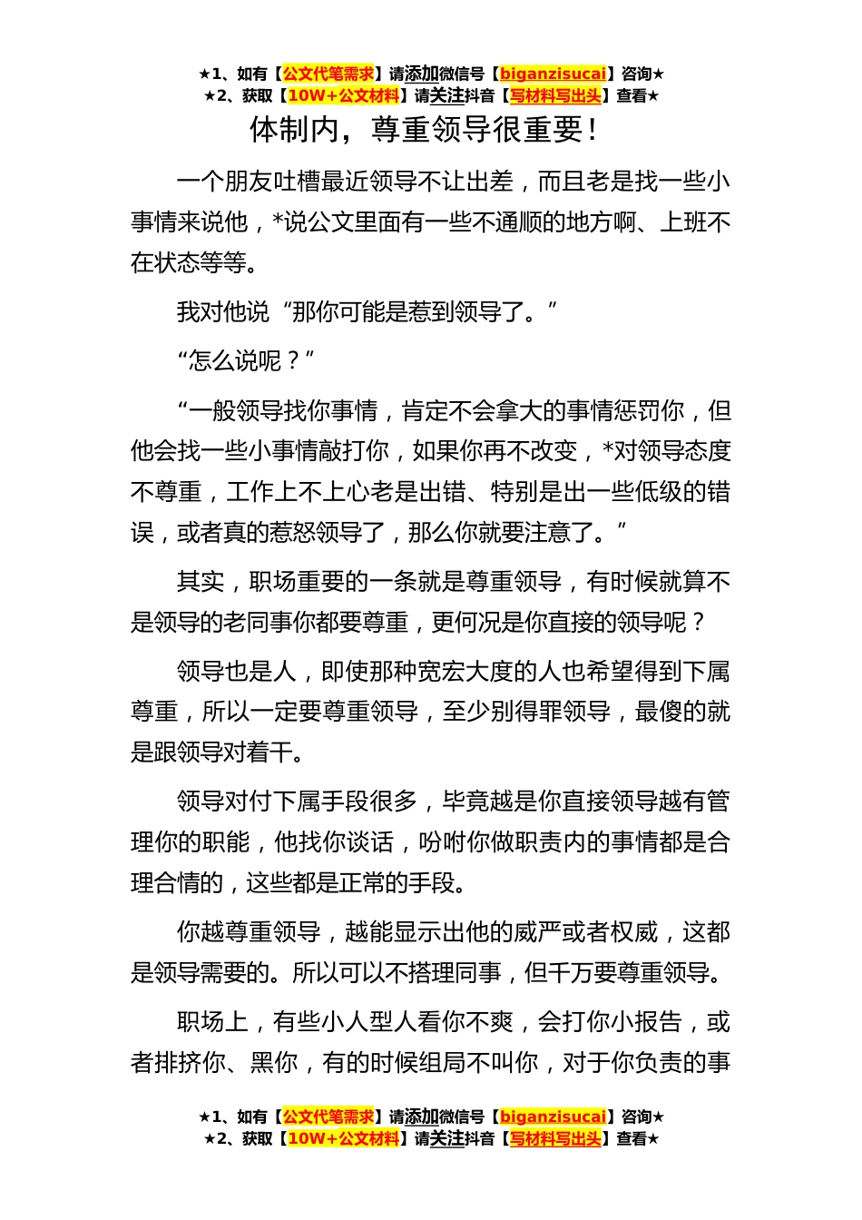 ★1、如有【公文代笔需求】请添加微信号【biganzisucai】咨询★★2、获取【10W+公文材料】请关注抖音【写材料写出头】查看★★1、如有【公文代笔需求】请添加微信号【biganzisucai】咨询★★2、获取【10W+公文材料】请关注抖音【写材料写出头】查看★★1、如有【公文代笔需求】请添加微信号【biganzisucai】咨询★★2、获取【10W+公文材料】请关注抖音【写材料写出头】查看★体制内,尊重领导很重要!一个朋友吐槽最近领导不让出差,而且老是找一些小事情来说他,*说公文里面有一些不通顺的地方啊、上班不在状态等等。我对他说“那你可能是惹到领导了。”“怎么说呢?”“一般领导找你事情,肯定不会拿大的事情惩罚你,但他会找一些小事情敲打你,如果你再不改变,*对领导态度不尊重,工作上不上心老是出错、特别...