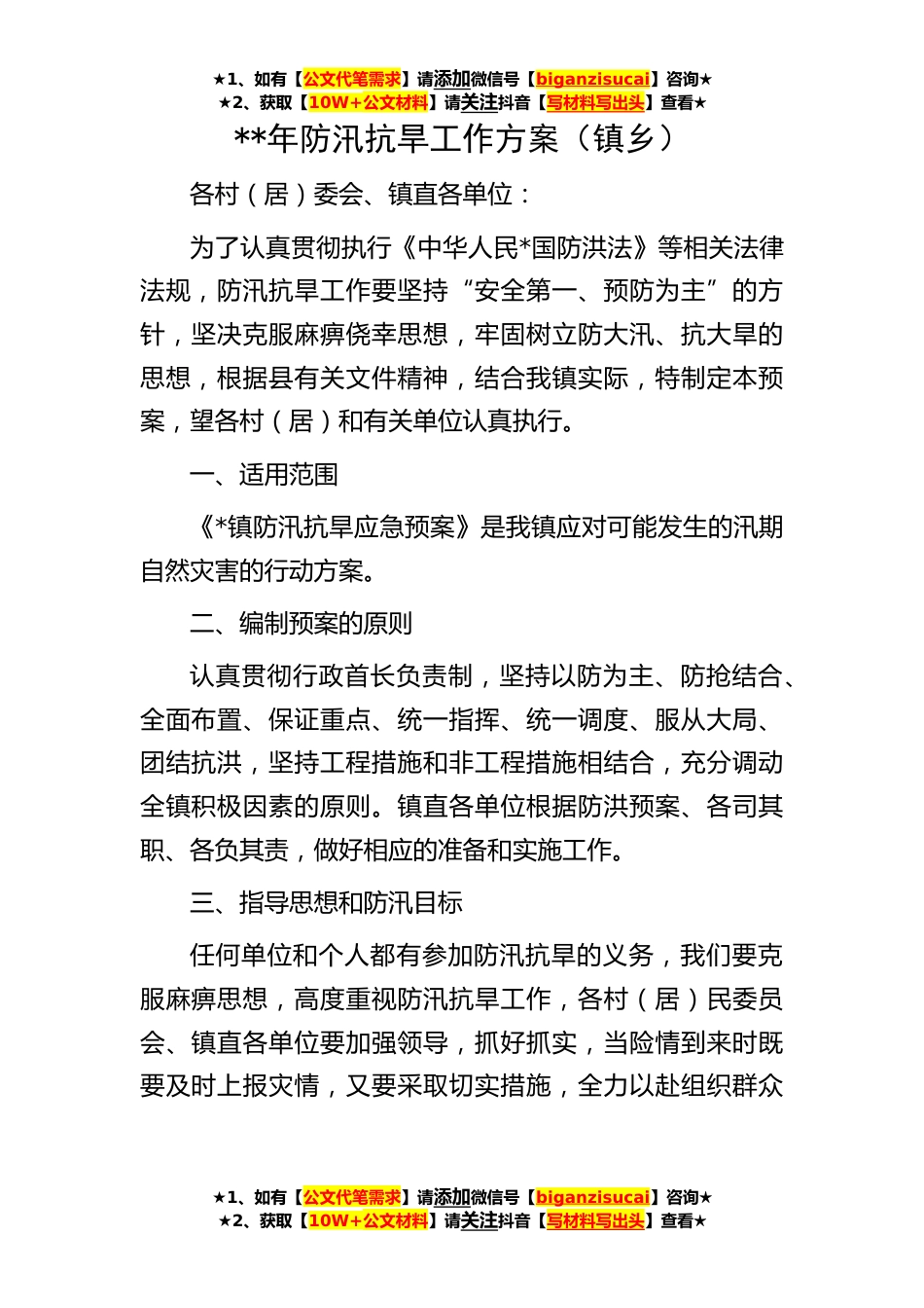 ★1、如有【公文代笔需求】请添加微信号【biganzisucai】咨询★★2、获取【10W+公文材料】请关注抖音【写材料写出头】查看★★1、如有【公文代笔需求】请添加微信号【biganzisucai】咨询★★2、获取【10W+公文材料】请关注抖音【写材料写出头】查看★★1、如有【公文代笔需求】请添加微信号【biganzisucai】咨询★★2、获取【10W+公文材料】请关注抖音【写材料写出头】查看★**年防汛抗旱工作方案(镇乡)各村(居)委会、镇直各单位:为了认真贯彻执行《中华人民*国防洪法》等相关法律法规,防汛抗旱工作要坚持“安全第一、预防为主”的方针,坚决克服麻痹侥幸思想,牢固树立防大汛、抗大旱的思想,根据县有关文件精神,结合我镇实际,特制定本预案,望各村(居)和有关单位认真执行。一、适用范围《*镇防汛抗旱...